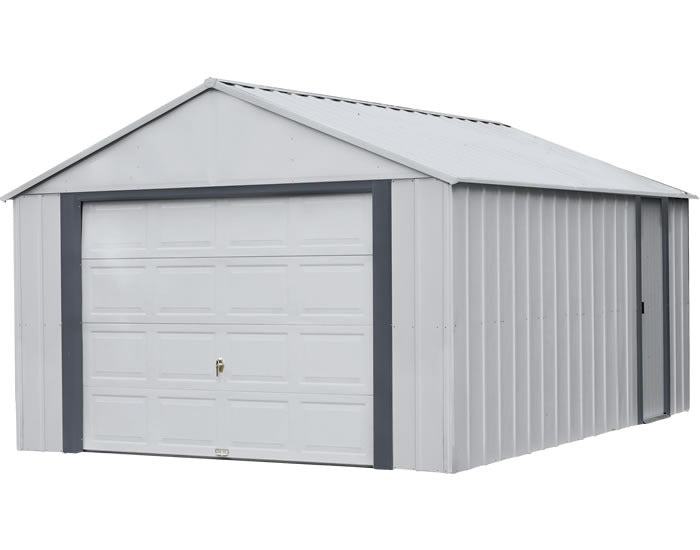 Need a warranty? It’s included! This storage garage comes standard with a free 12 year limited warranty included so you can rest assured you have a great building that will last. If you have a problem later simply open a warranty claim to help resolve virtually anything you need! Did we mention how great this building looks? The paint finish is a flute gray color on the walls, roof and doors with a dark gray (anthracite) color on the trim borders. These great colors blend well with most any surroundings and will beautify your backyard or parking areas! Now that you’ve selected this building get ready to save a ton over building a wood structure and also get ready for easy assembly! All of the parts for this shed are pre-cut and have pre-drilled holes ready for you to assemble quick and easy. You’ll just need common household tools to erect this building. You’ll want a cordless drill to help get done even quicker! What are you waiting for, get started by ordering now and get your do it yourself project going to get all the benefits you deserve. Available in six sizes from 12’x10′ to 14’x31′.