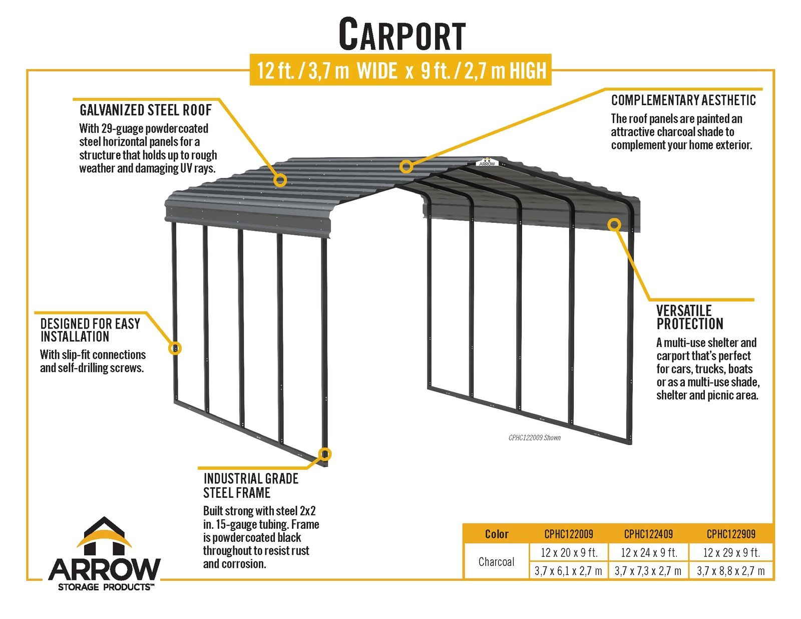 Arrow Carport, 12 ft. x 24 ft. x 9 ft. Charcoal