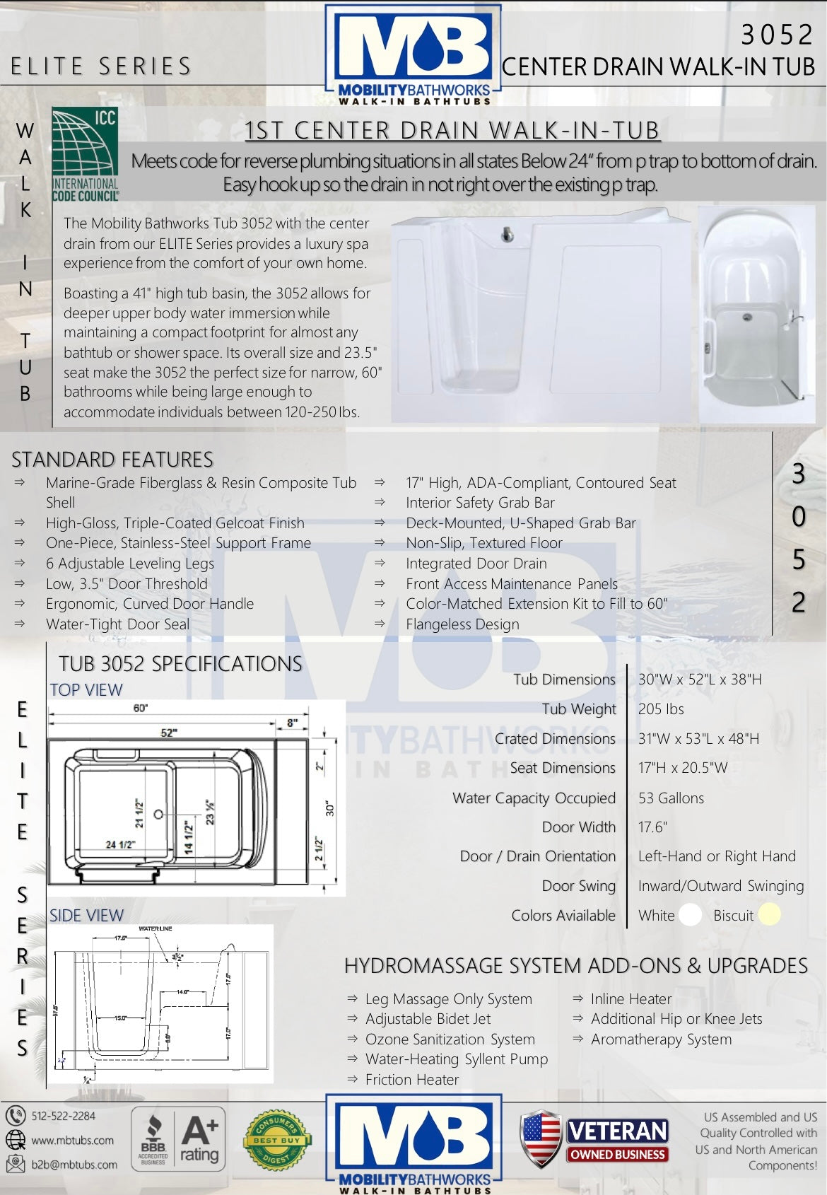 The Mobility Bathworks Tub 3052 with the center drain from our ELITE Series provides a luxury spa experience from the comfort of your own home. Boasting a 41″ high tub basin, the 3052 allows for deeper upper body water immersion while maintaining a compact footprint for almost any bathtub or shower space. Its overall size and 23.5″ seat make the 3052 the perfect size for narrow, 60″ bathrooms while being large enough to accommodate individuals between 120-250 lbs.