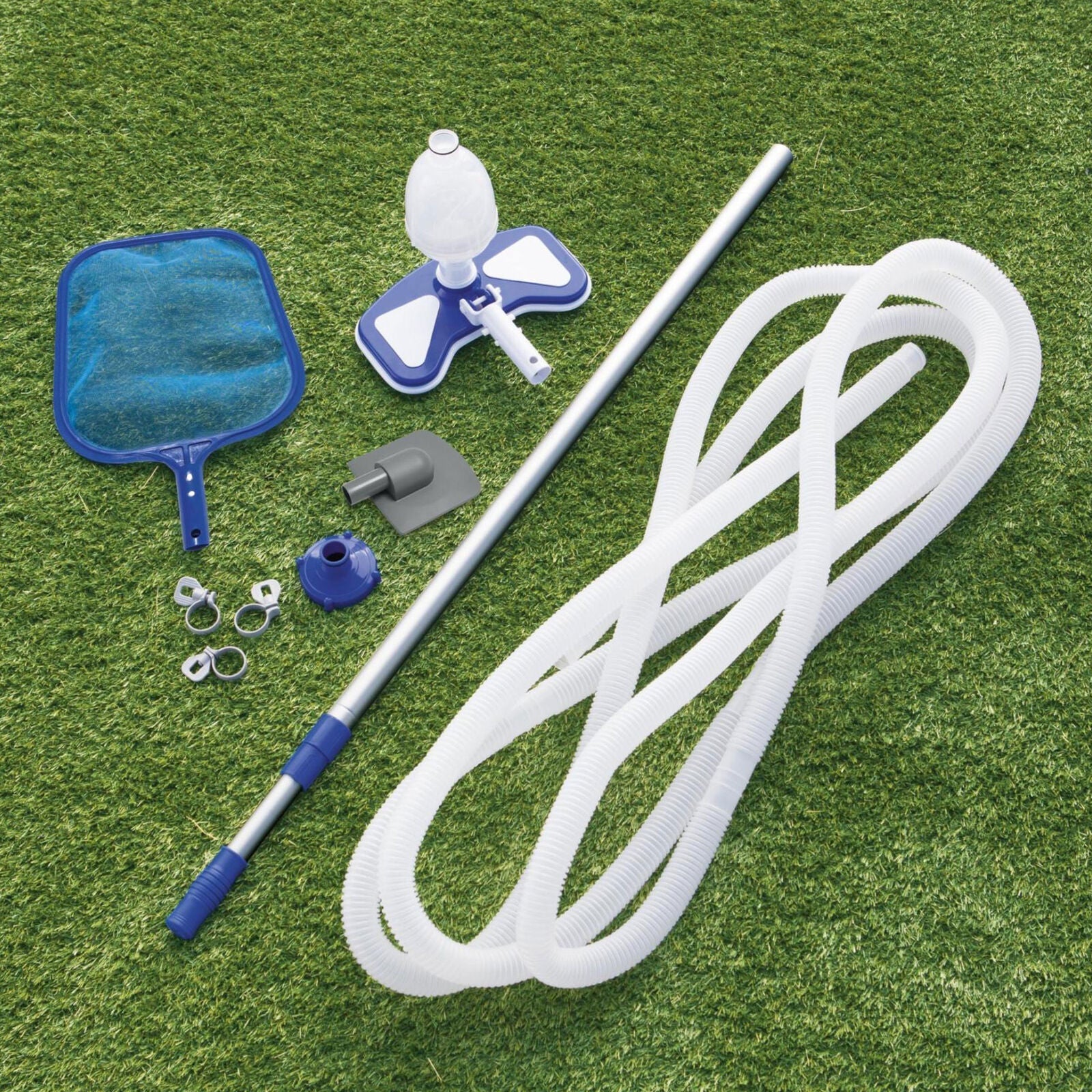 The Bestway Deluxe Swimming Pool Cleaning Kit is a great addition to any above ground pool or pool maintenance set. The kit includes a vacuum and a 9-foot pool skimmer. The skimmer consists of a 110-inch aluminum pole with a durable mesh netting. The net scoops up leaves and floating organics in your pool. The vacuum is powerful and works hard to suck up the algae, debris, and scum lurking in your pool.