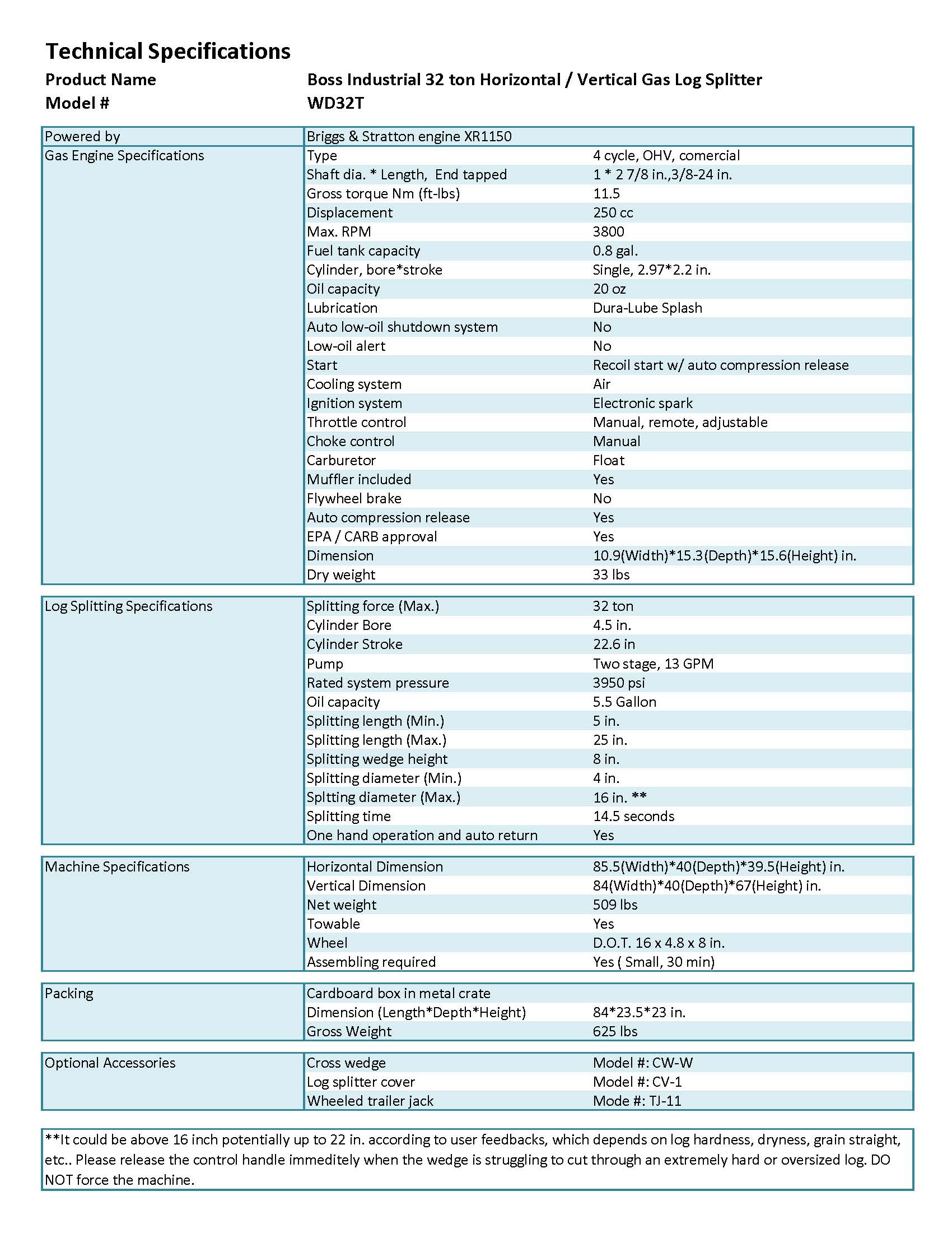 With the Boss Industrial Professional 32 Ton Horizontal / Vertical Gas Log Splitter, you will split wood like a pro and keep your fireplace full all winter. Better still, Boss stands by its excellent product quality with a 2 year warranty including hydraulics!