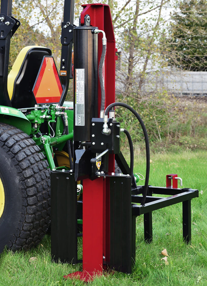 The Boss Industrial 35 ton Commercial Grade 3-point log splitter runs off your tractors hydraulics and can split in both the horizontal or vertical position. No need to lift heavier logs up to it, just shift to the vertical position.