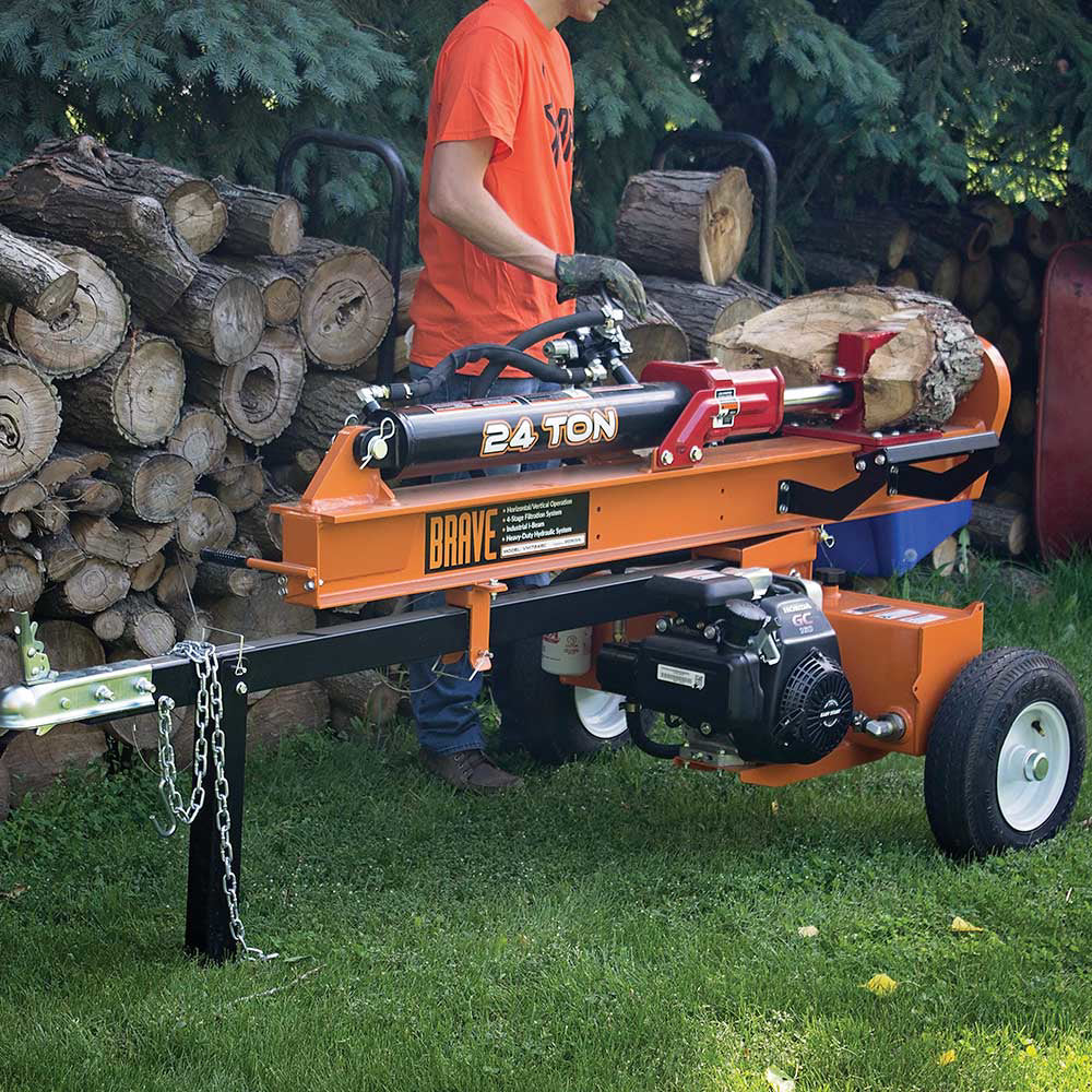 This Brave VH1724GC 24 ton log splitter that has the convenient option to split Vertical and Horizontal. The orange powder coated wood splitters were designed with durability in mind.