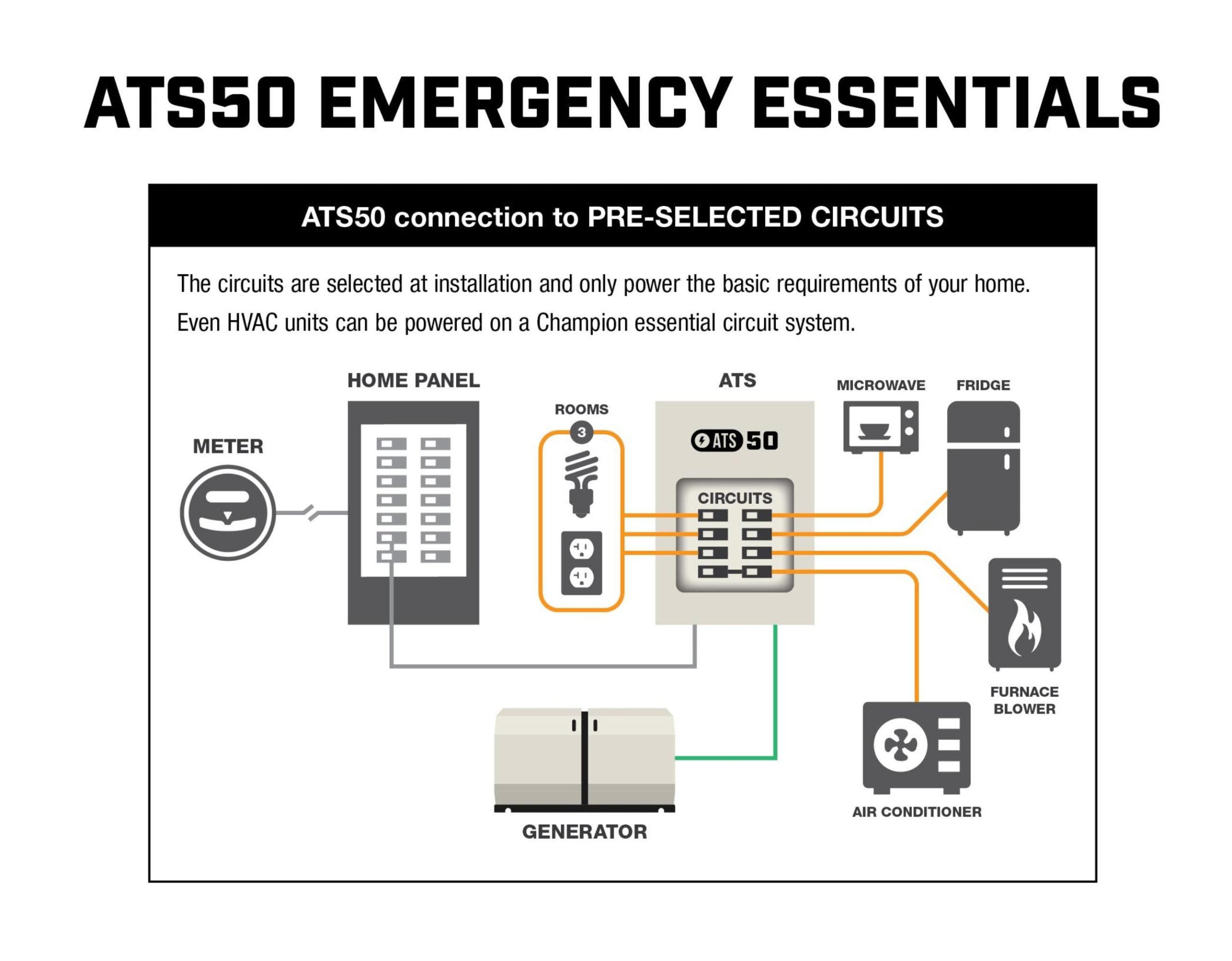 The ATS50 Emergency Essentials Automatic Transfer Switch has 12 available circuits available and provides seamless power to your home during an outage