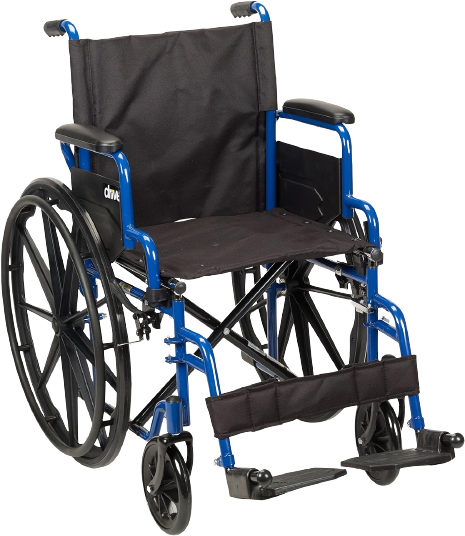 Adult and senior Drive Medical Blue Streak lightweight wheelchairs come with innovative features including desk arms that fold back for simple transfers, calf straps, and swing-away foot rests. These lightweight, transportable wheelchairs include a handy seatback pocket and a 16-inch cushioned seat that is ergonomically designed for comfort. The solid rubber detachable tyres with push-to-lock capability provide further safety and a constantly smooth ride. They are installed on composite wheels. The elegant wheelchair frame with blue powder coating is made of sturdy steel and can hold up to 250 pounds. Both the nylon seat upholstery and the black cross bracing are lightweight, durable, and easily cleaned. The wheelchair folds up effortlessly to a small 12.5-inch width, and it weighs only 41.25 pounds, which makes it easy to load into a trunk or place for storage.