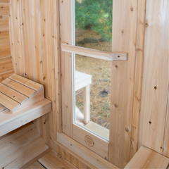 Canadian Timber Serenity Barrel Sauna This Canadian Timber Collection Sauna by Dundalk LeisureCraft is handcrafted from Eastern White Cedar that is lighter in color and has tight knots in the wood. The door is 5mm bronze tempered glass with wooden frame and pre-hung on the front wall for easy installation. This Sauna kit comes with solid cedar cradles, aluminum bands with stainless steel hardware and is packaged in a ready to assemble kit. This model features a built in front porch with benches so you have a cooling down area on the outside of the sauna as well some protection from the front door when it is opened during sauna use. The round concept of the barrel sauna make it unique and very efficient to heat as well as encourages proper air flow during sauna use. Product Information Product Features Front Porch – 45cm Front Porch with benches included in with this model. Eastern White Cedar – Sustainable Sourced Eastern White Cedar Flat Floor Included – Flat Floor Included in Canadian Timber Saunas. Aluminum Bands – Marine Grade Aluminum Bands with stainless steel tightening bolts. Sturdy Wood Benches – Sturdy Bench Design for sitting up or laying down. Documents Product Drawing.pdf Parts List.pdf Assembly Instructions.pdfCanadian Timber Serenity Barrel SaunaThis Canadian Timber Collection Sauna by Dundalk LeisureCraft is handcrafted from Eastern White Cedar that is lighter in color and has tight knots in the wood. The door is 5mm bronze tempered glass with wooden frame and pre-hung on the front wall for easy installation. This Sauna kit comes with solid cedar cradles, aluminum bands with stainless steel hardware and is packaged in a ready to assemble kit.This model features a built in front porch with benches so you have a cooling down area on the outside of the sauna as well some protection from the front door when it is opened during sauna use. The round concept of the barrel sauna make it unique and very efficient to heat as well as encourages proper air flow during sauna use.Product InformationProduct FeaturesFront Porch – 45cm Front Porch with benches included in with this model.Eastern White Cedar – Sustainable Sourced Eastern White CedarFlat Floor Included – Flat Floor Included in Canadian Timber Saunas.Aluminum Bands – Marine Grade Aluminum Bands with stainless steel tightening bolts.Sturdy Wood Benches – Sturdy Bench Design for sitting up or laying down.DocumentsProduct Drawing.pdfParts List.pdfAssembly Instructions.pdfCanadian Timber Serenity Barrel SaunaThis Canadian Timber Collection Sauna by Dundalk LeisureCraft is handcrafted from Eastern White Cedar that is lighter in color and has tight knots in the wood. Th