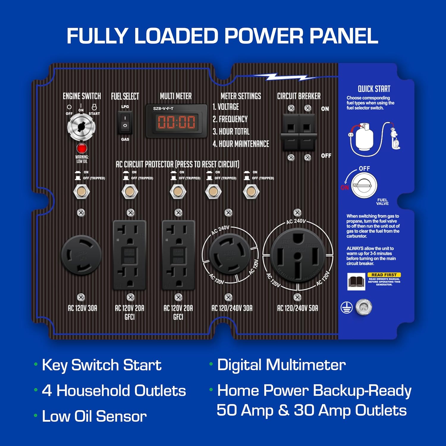 • The XP13000EH comes with a push button start, a front facing interface that allows you to change your fuel type in seconds, and a wide variety of outlets (including a transfer switch-ready 50 amp outlet)