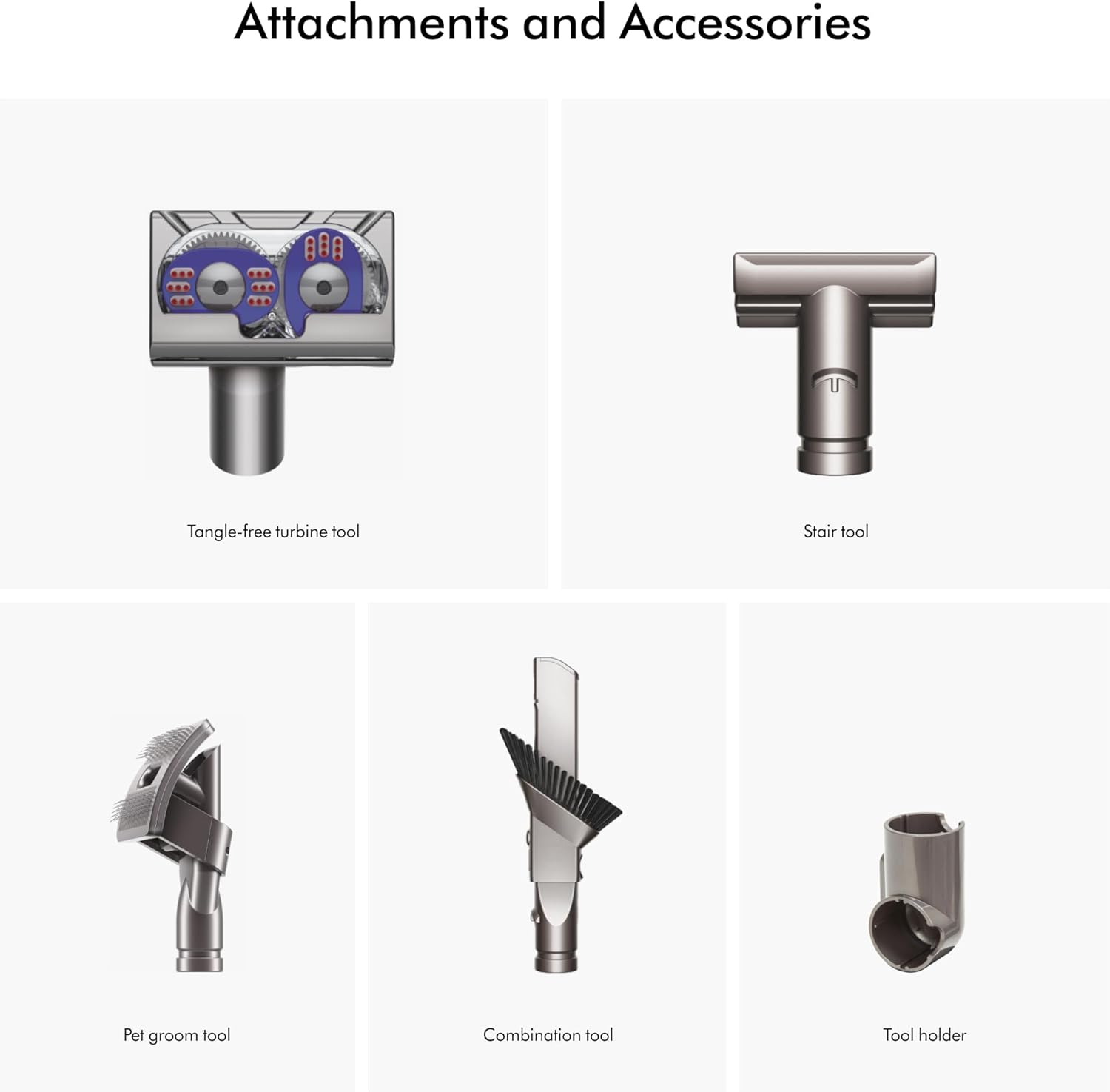 • 5 Dyson-Engineered accessories. Tangle-free turbine tool, groom tool, tool holder, stair tool, combination tool.