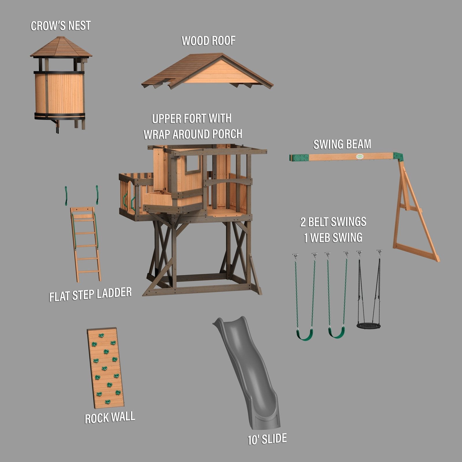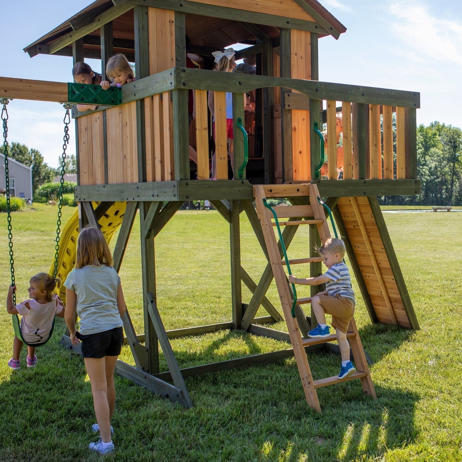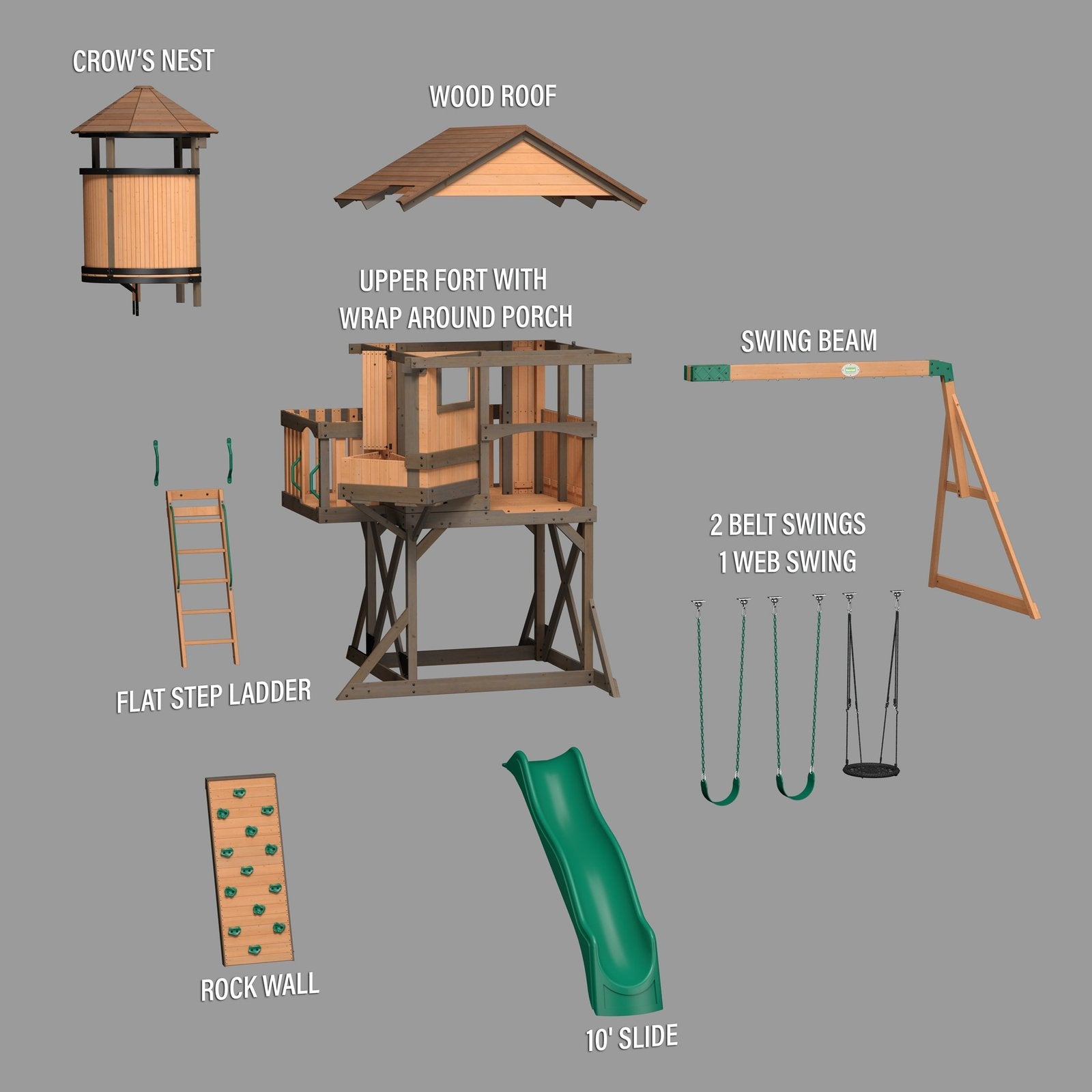Part hideout, part lookout, part campout — the activities your kids will enjoy in the Eagles Nest Elite Swing Set go on and on.