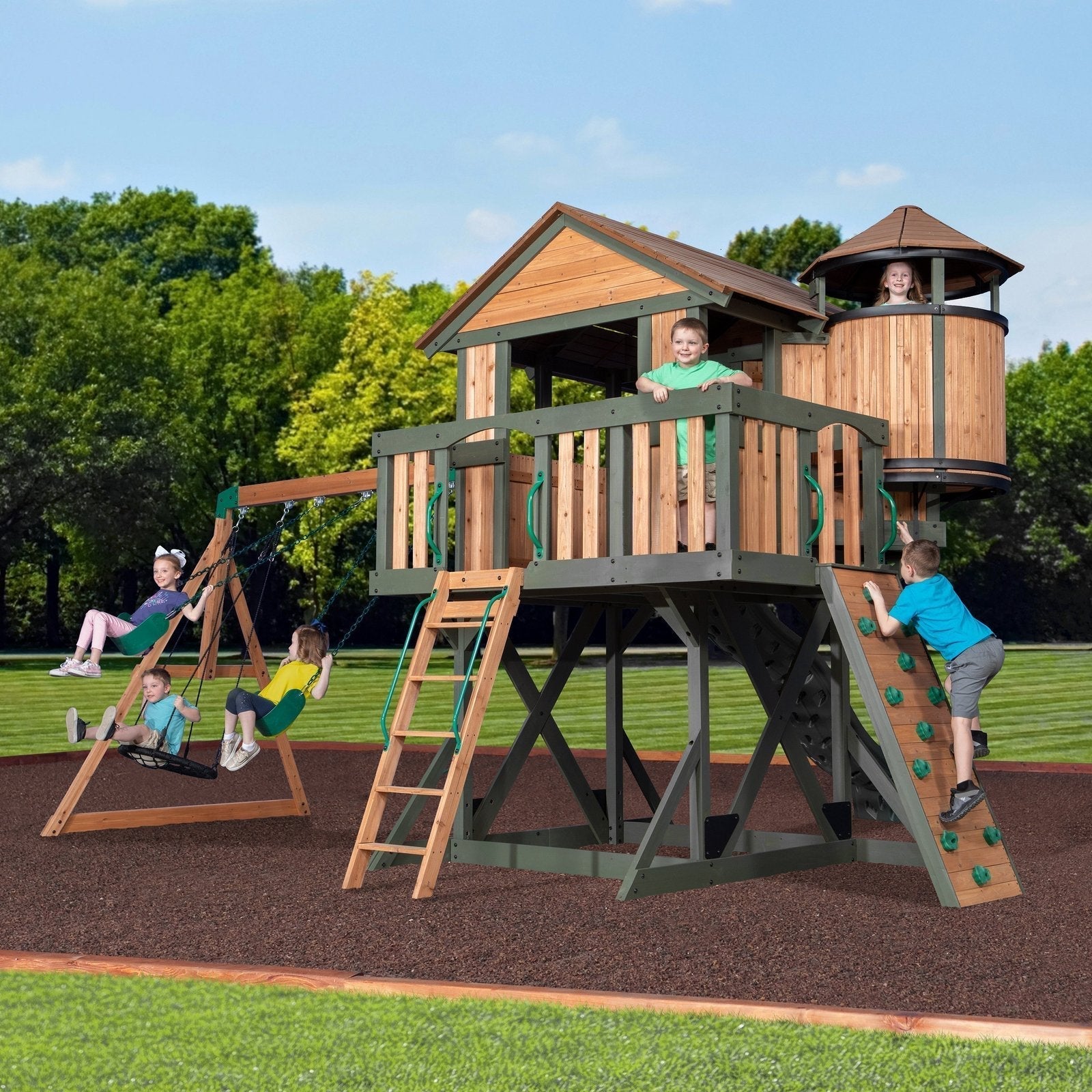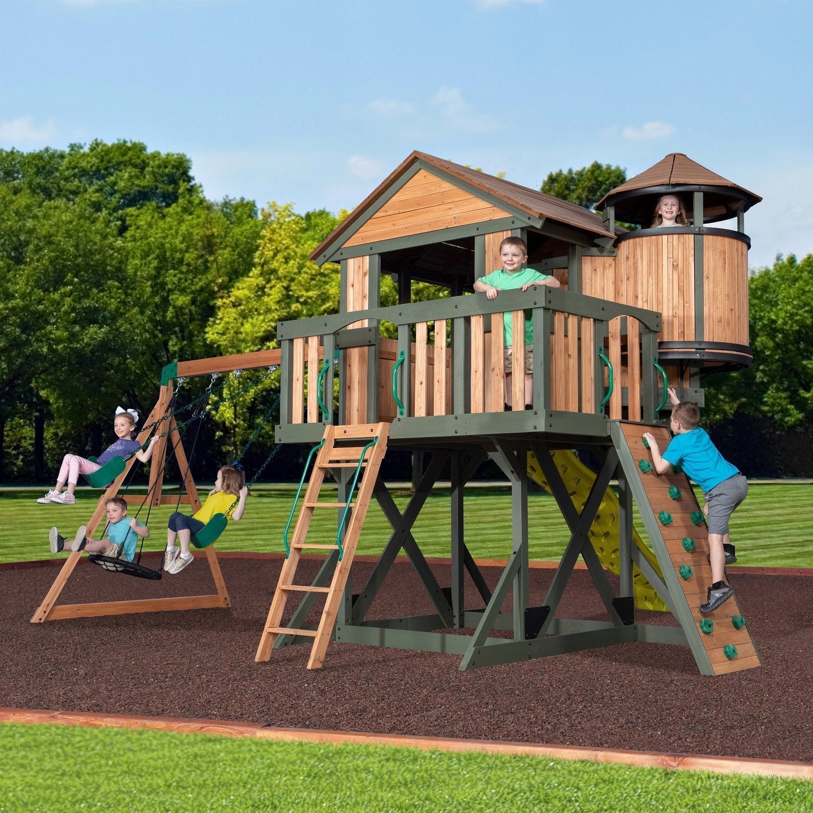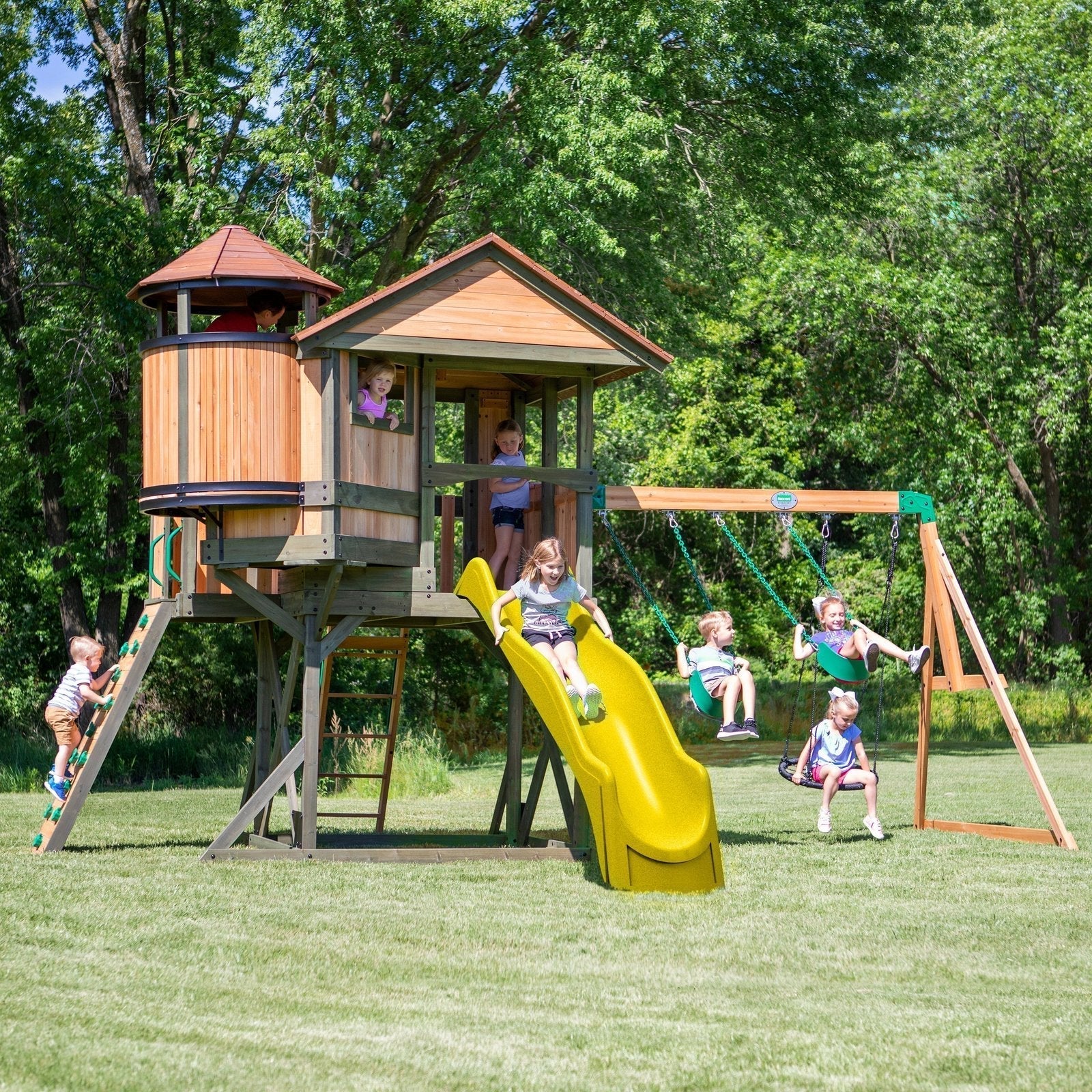 Part hideout, part lookout, part campout — the activities your kids will enjoy in the Eagles Nest Elite Swing Set go on and on.
