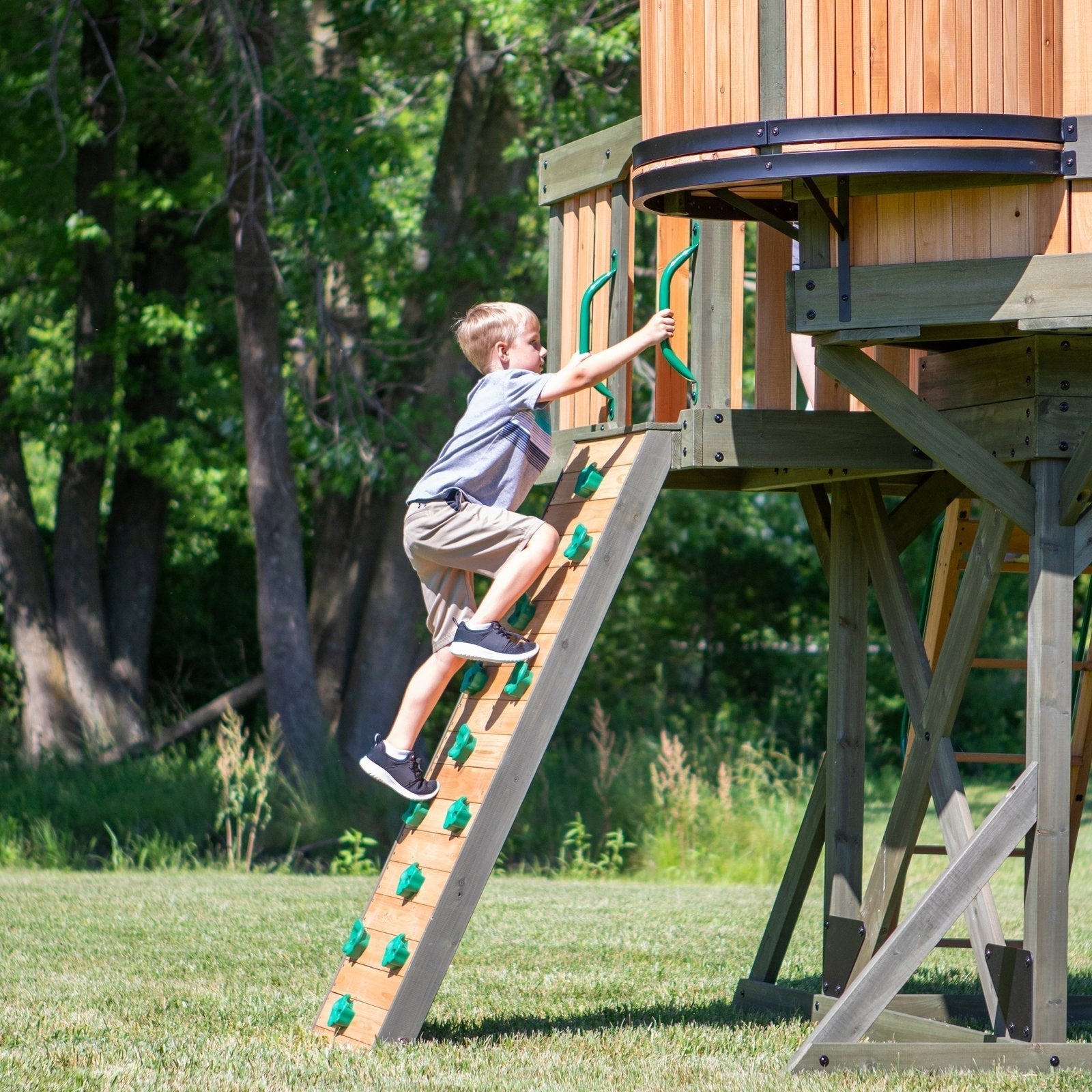 With one of the tallest and most spacious clubhouses available, it’s the perfect combination of playhouse and swing set. Get ready to see smiling faces climbing the rock wall, hanging out in the crow’s nest, and spending hours and hours having fun outside.