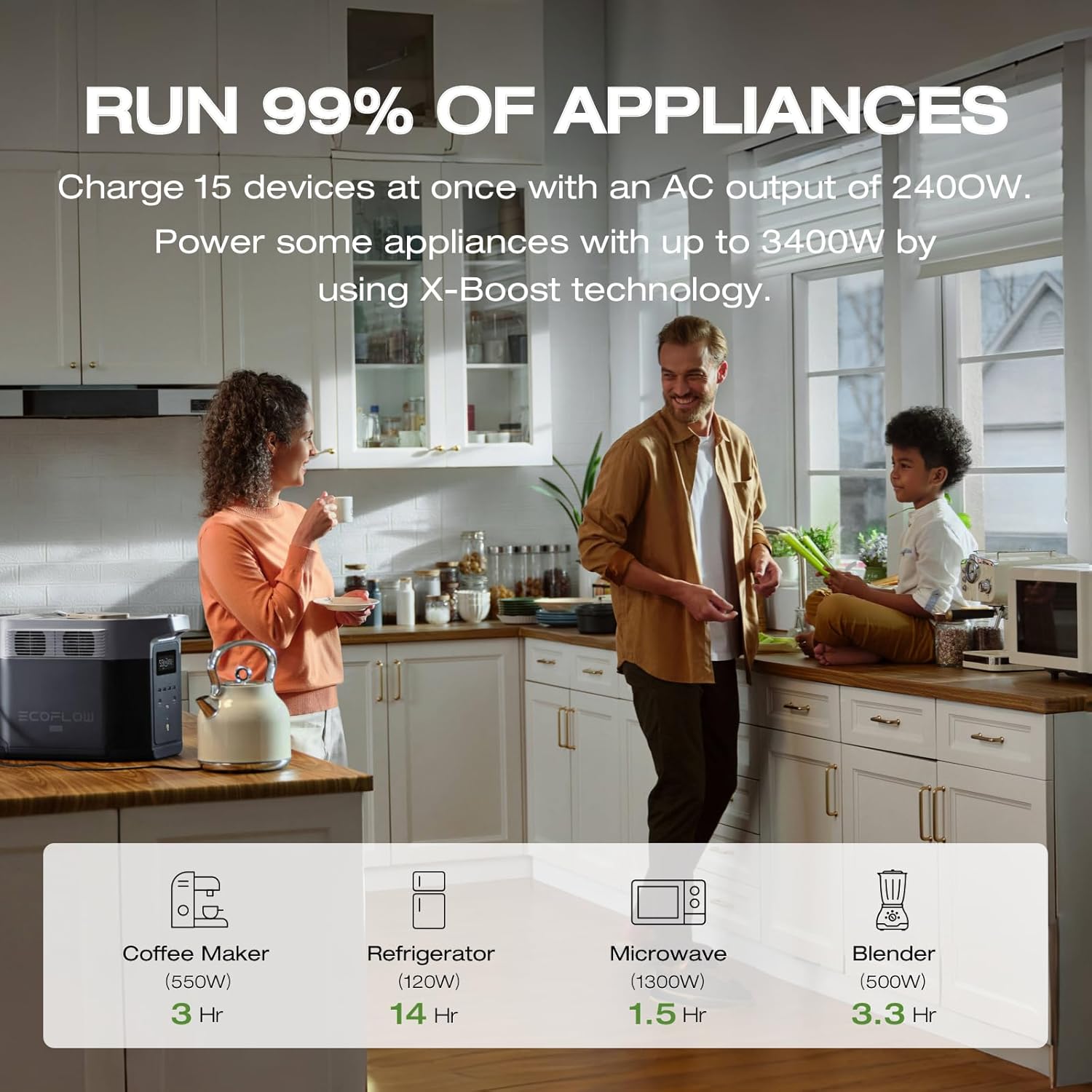 With 2400W output (up to 3400W in boost mode), it can run 99% of home devices. Includes 15 outlets to power multiple electronics at once.