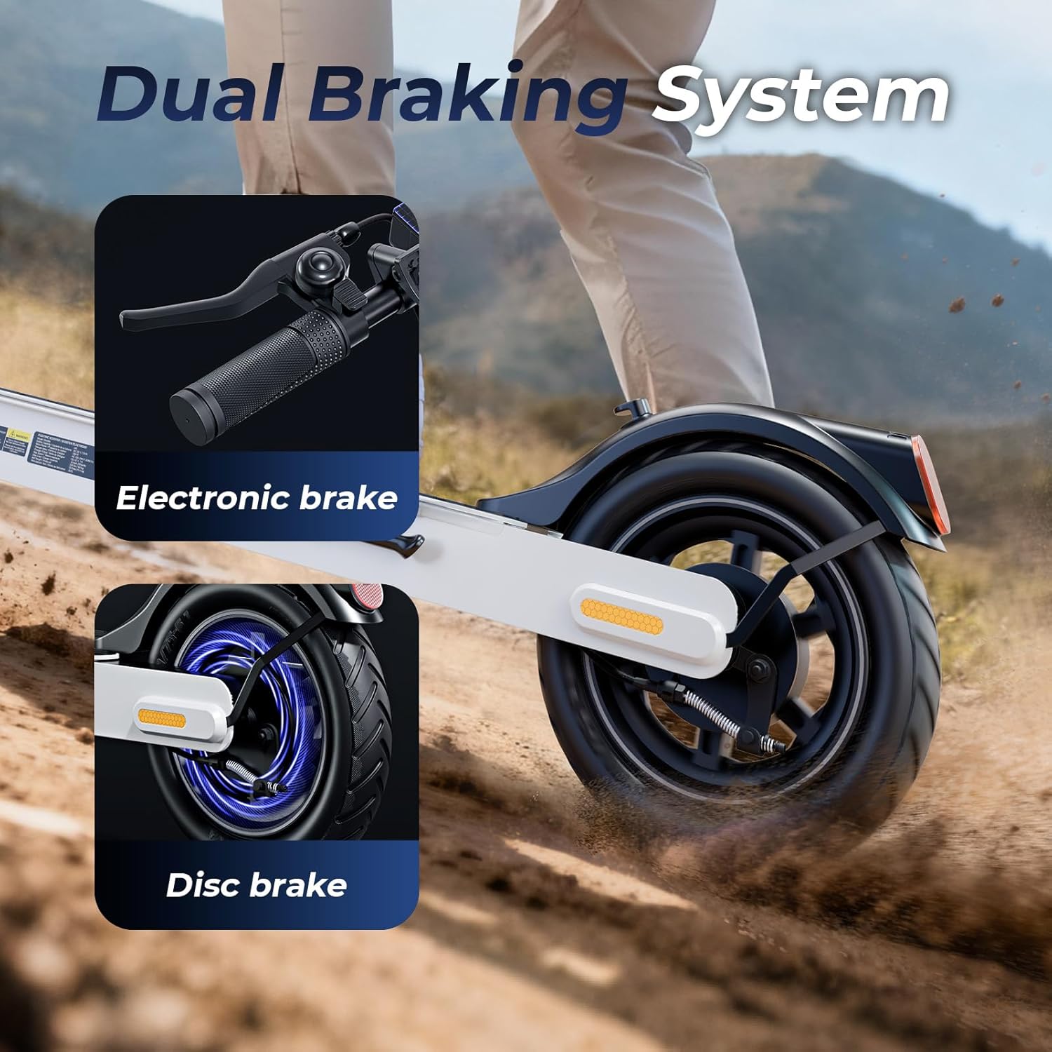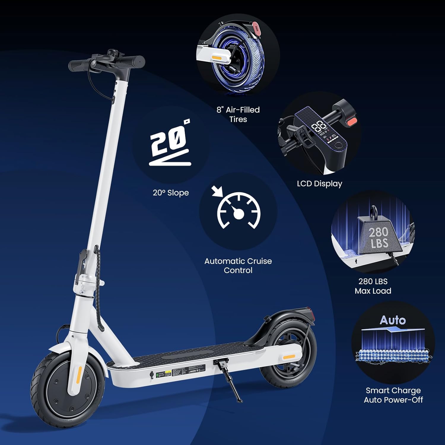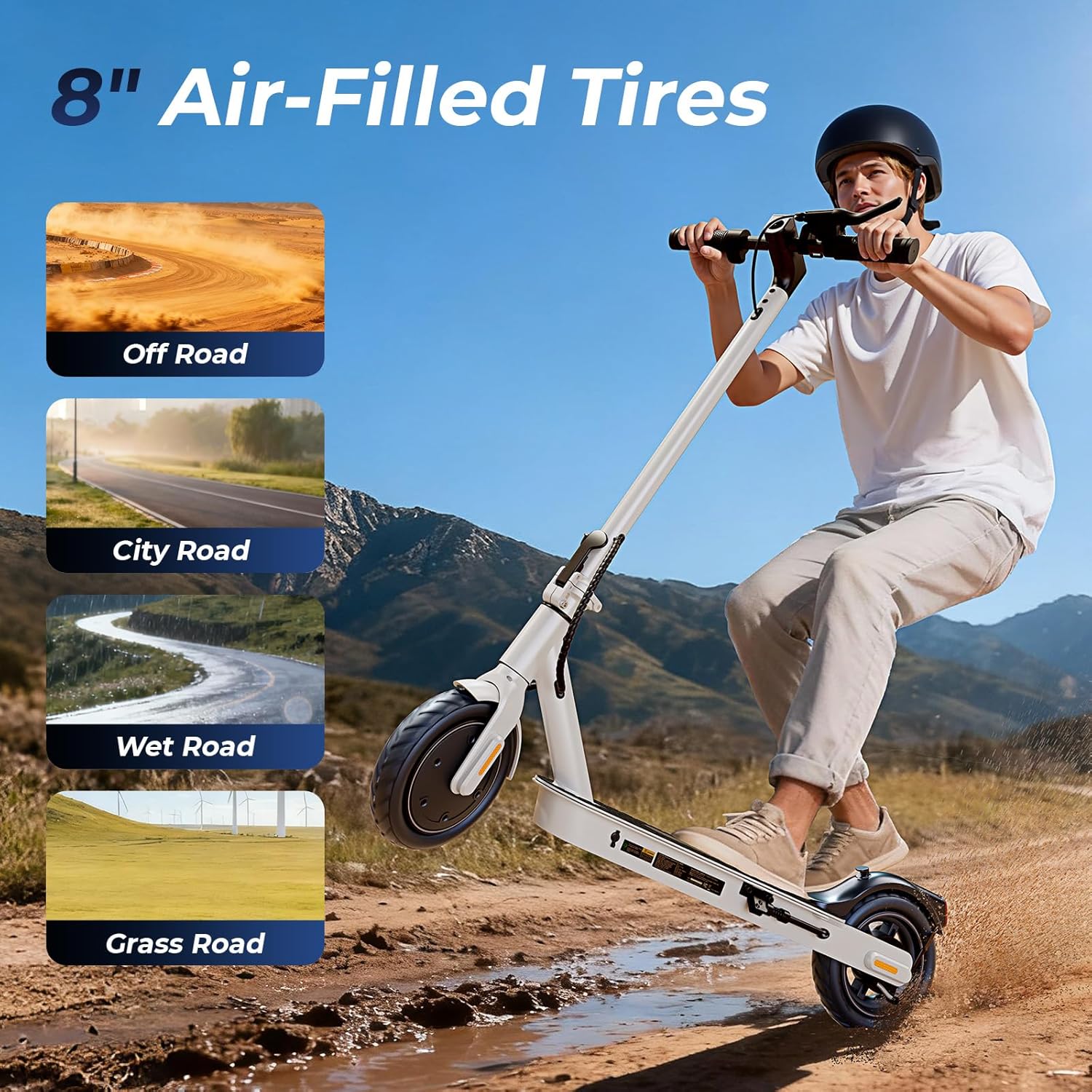 Durable 8.5″ Pneumatic Tires & IPX4 Water Resistance: Air-filled tires provide excellent shock absorption and grip, easily handling slopes up to 20°. With IPX4 water resistance, it withstands splashes and light rain for all-weather commuting.