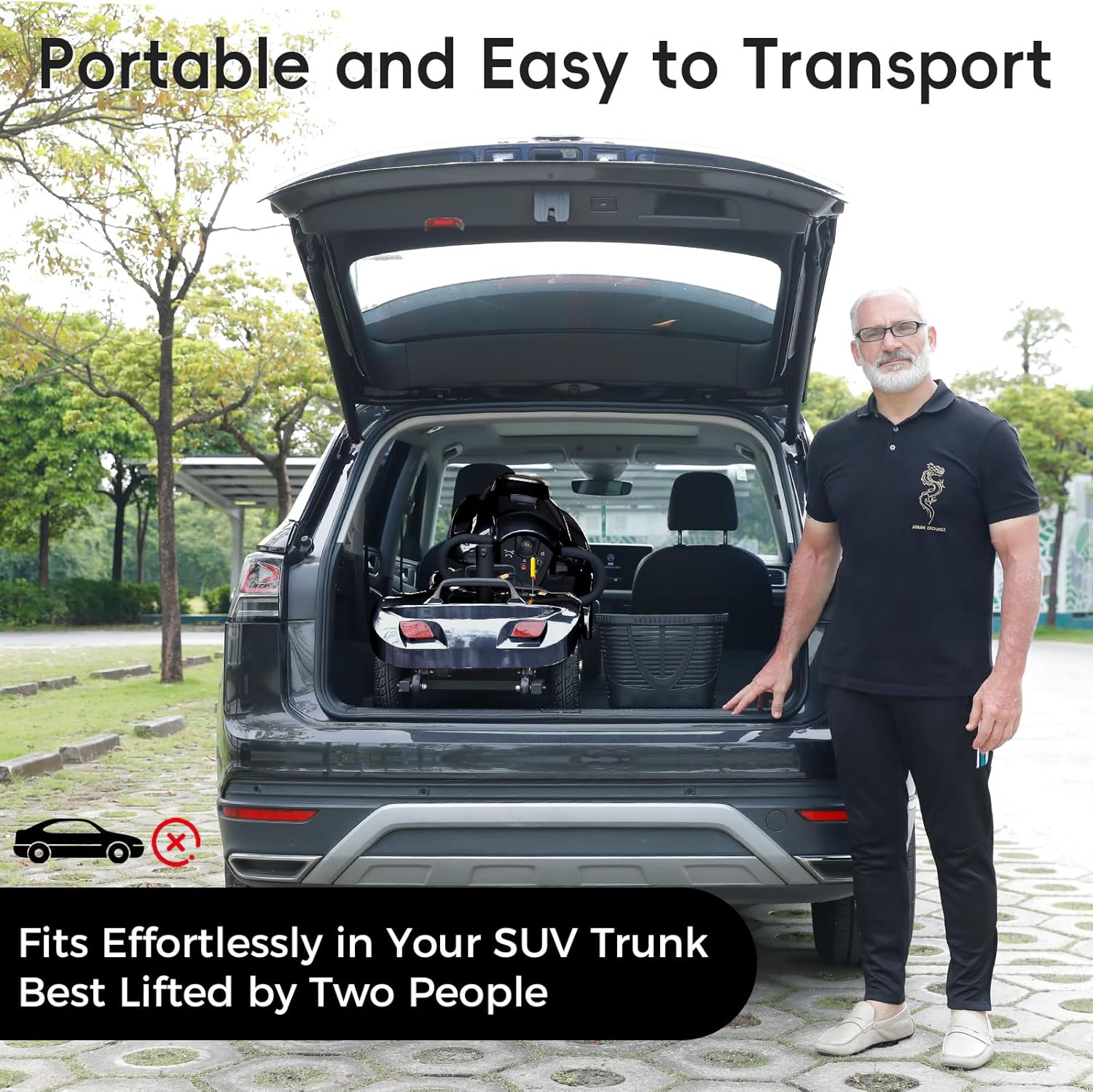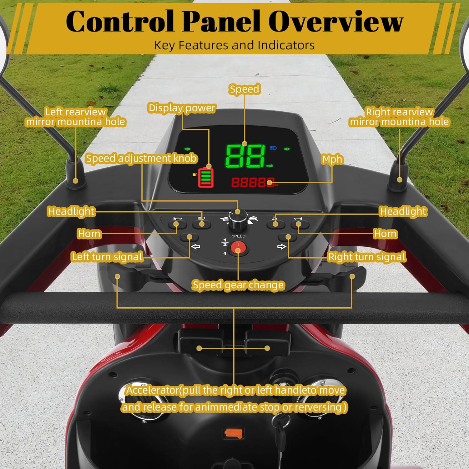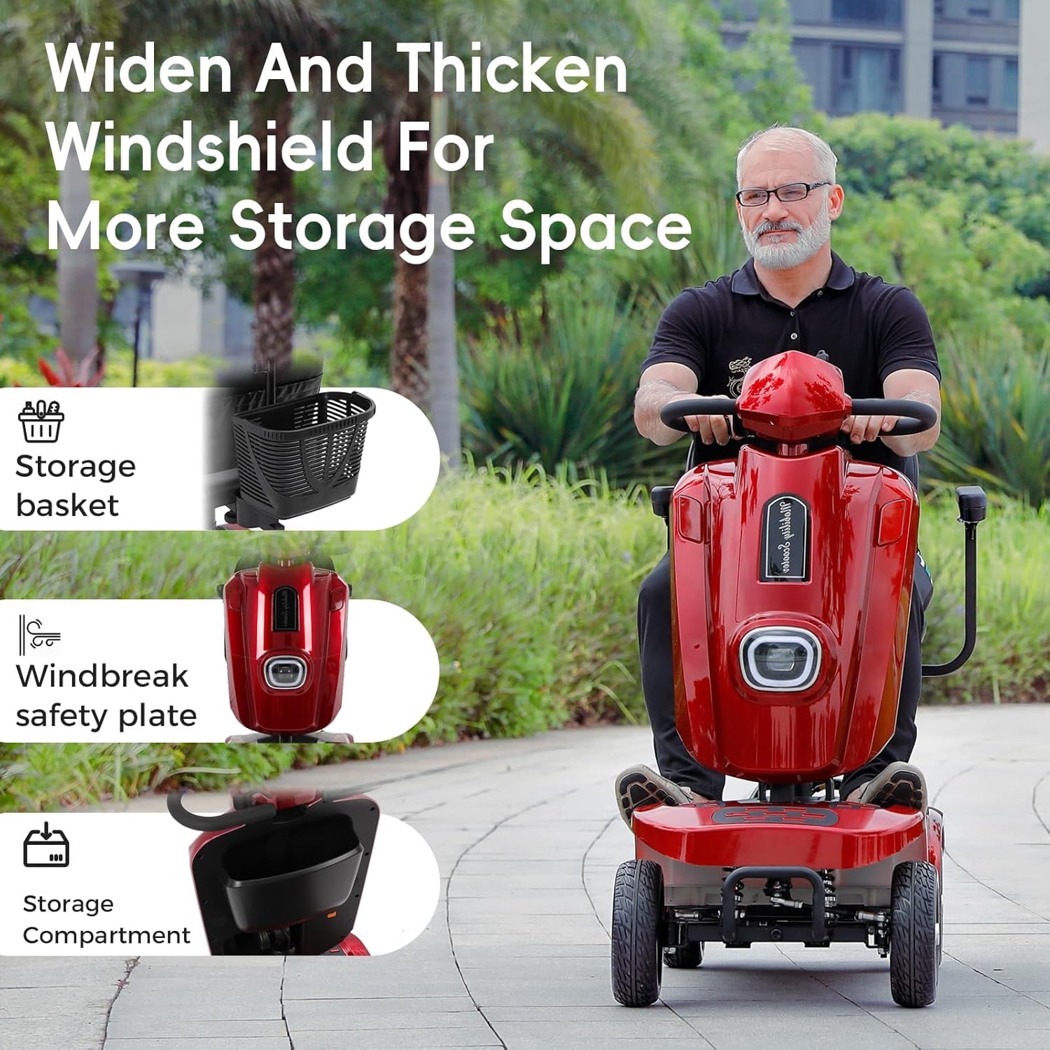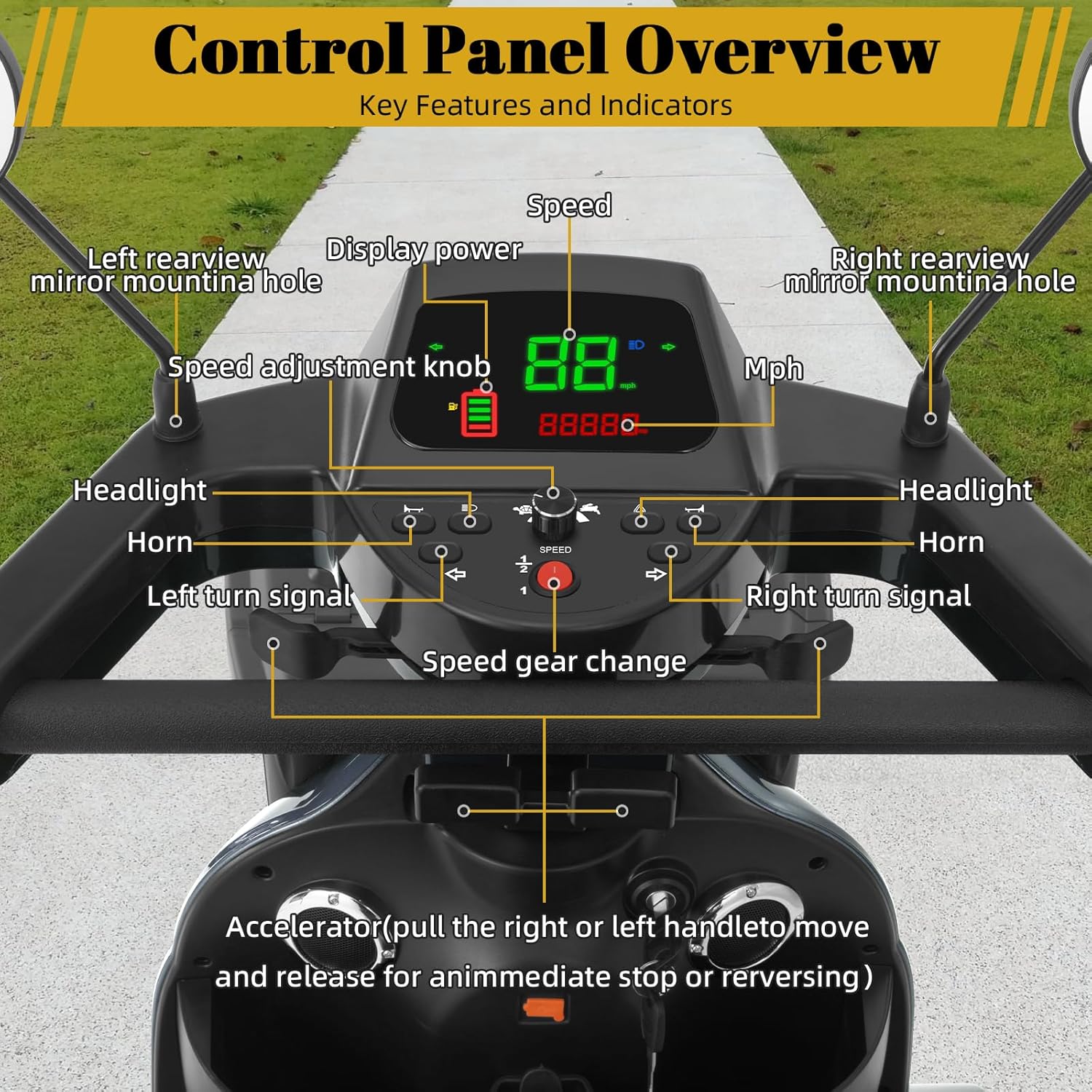 • Unique Windshield & Extra Storage: Front windbreak safety plate, cane stand, rear basket, and storage compartments for added convenience.