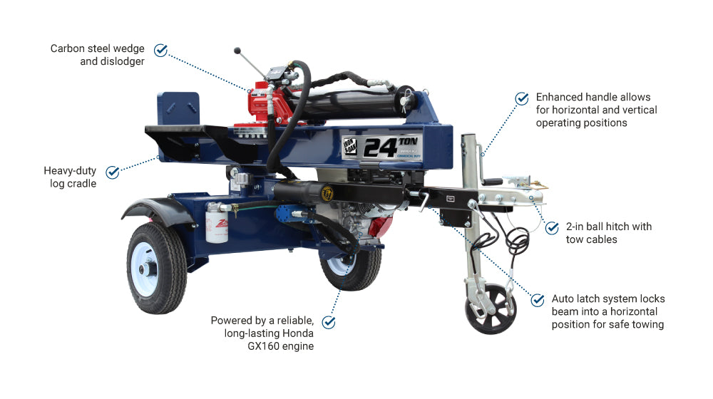 This BHVH2418GX Iron and oak log splitter is built with top quality parts such as Brand valves and Concentric pumps. This model is powered by a commercial Honda GX160 engine. These motors are commercial rated and provide maximum efficiency, performance and power with minimal noise and emissions. Honda engines have a 3 year commercial grade warranty.