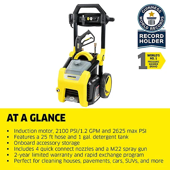The Karcher Performance Series K2100PS Electric Pressure Washer delivers 2100 PSI of TruPressure, providing exceptional cleaning power with a rugged brushless induction motor for extended durability and quieter operation. Featuring a folding handle, onboard detergent tank, and four quick-connect nozzles, this machine is perfect for cleaning driveways, sidewalks, decks, cars, RVs, and more.
