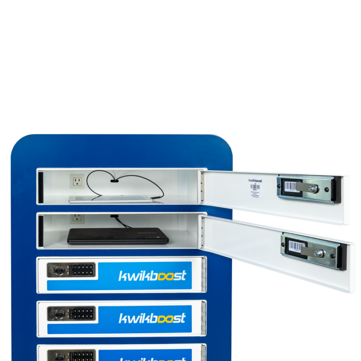 Lock it, leave it, and come back to a fully charged device. The KwikBoost® 10-Bay Multi-Device Charging Locker makes charging easy, convenient, and secure. Designed for “front of house” applications such as hotels, convention centers, campuses, and more, it’s ideal for locations with longer dwell times and situations where guests need to leave devices unattended. Outfitted with a selection of premium-quality, braided charging cables, it can power virtually every mobile device on the market. Since it plugs into a standard wall outlet and features a freestanding design, setup is simple and quick. Best of all, this product comes with custom graphics. So, in addition to providing a valuable service to your customers, guests, or students, you can promote your brand or convey important messaging.