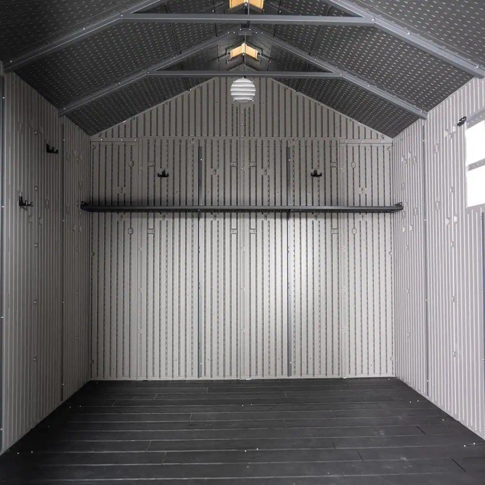 Make organization a breeze and declutter your garage with the right storage solution. The Lifetime 8 foot by 10 foot Shed is a stylish storage space that is strong, secure, and easy to maintain. The Double Wall System (DWS) and steel-reinforcement provide incredible strength for long-lasting performance. The UV-protected and weather-resistant build combined with the excellent rain and snow drainage allows this shed to effectively withstand the elements. The steel-reinforced, lockable doors (lock not included) will give you excellent security for your belongings. The height adjustable shelf gives you more options for storing items throughout the shed. The panel skylights and window offer excellent interior lighting. Free up space in your garage and better organize your tools and equipment with a Lifetime 8 Foot by 10 Foot Shed.