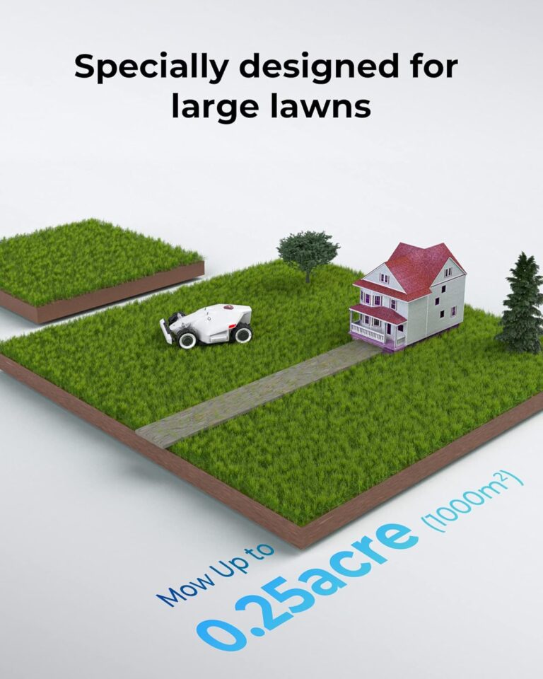 - MOW LAWN UP TO 0.25 ACRE (0.13 ACRE/H): The LUBA AWD 1000 robotic lawn mower features dual cutting plates and a 16-inch (400mm) cutting width, ensuring thorough grass cutting without any missed areas. Compared to the random mowing pattern of conventional robotic mowers, the planned route algorithm significantly improves Luba’s mowing efficiency. It has a super high efficiency of mowing up to 0.13 acre (500㎡) each hour, allowing your family to enjoying more time on picture-perfect lawn.
