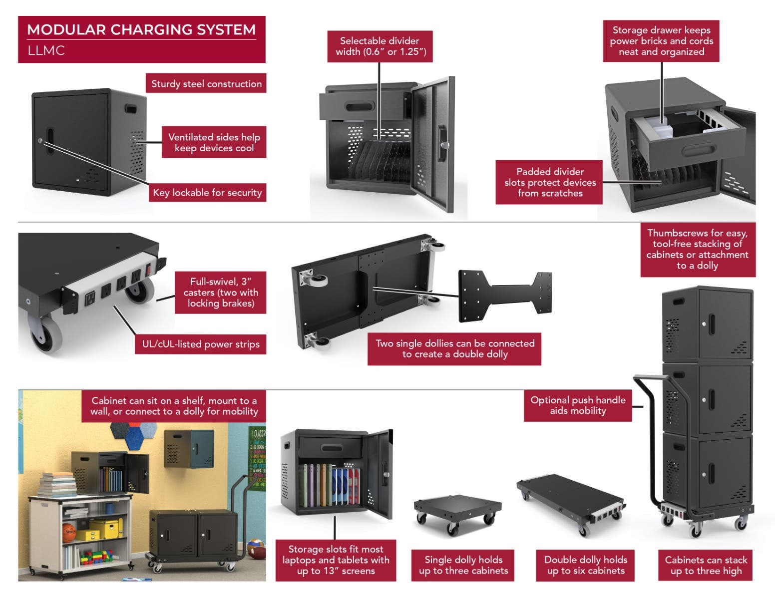 - Each modular charging cabinet holds up to 10 laptops or tablets with up to 13” screens