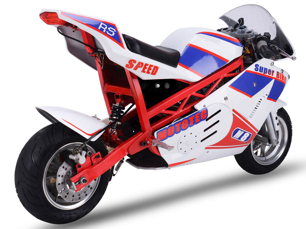 Introducing the new MotoTec 1000w 48v Electric Superbike! Larger than a pocket bike and loaded with power. Features include: Leather padded seat, kick stand, half twist throttle for safety, key start, front and rear suspension, large tires with front and rear hydraulic disc brakes.