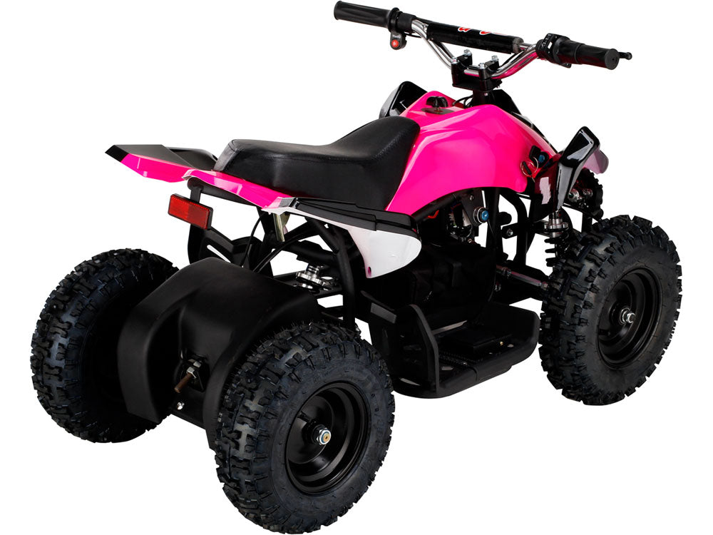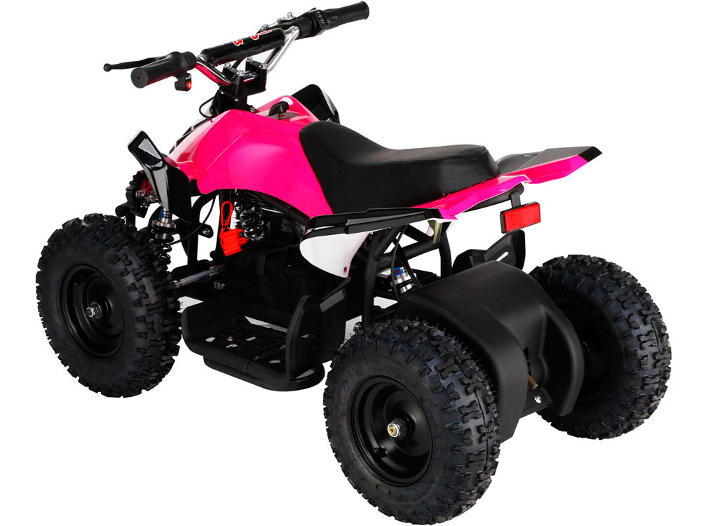 The MotoTec 24v Mini Quad v2 is the ultimate kids atv! Great for driveway and backyard fun, cruise over bumps and speed through dirt trails with ease. Comes standard with front & rear suspension, front & rear brakes and large 13 inch knobby pneumatic tires. This mini quad provides longer ride times than the competition with TWO large 12v 12amp hour batteries. New features include: headlight, key start, battery meter, forward & reverse, 2 speeds selectable by key and twist throttle with safety foot switch.