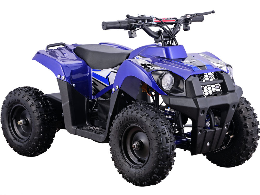 The MotoTec 36v Mini Quad Monster v6 is the ultimate kids atv! Great for driveway and backyard fun, cruise over bumps and speed through dirt trails with ease. Comes standard with front & rear suspension, front & rear brakes and large 13 inch knobby pneumatic tires. This mini quad provides longer ride times than the competition with THREE large 12v 12amp hour batteries. New features include: headlight, key start, battery meter, forward & reverse, 2 speeds selectable by key and twist throttle with safety foot switch.
