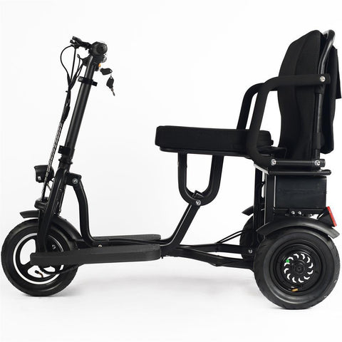 Have no problem with parking and storage. The three-wheeled MotoTec Folding Mobility Electric Trike folds completely into the size of a golf bag, so you can keep it inside for storage. The folded frame has wheels so you can just roll it around. What a great design!