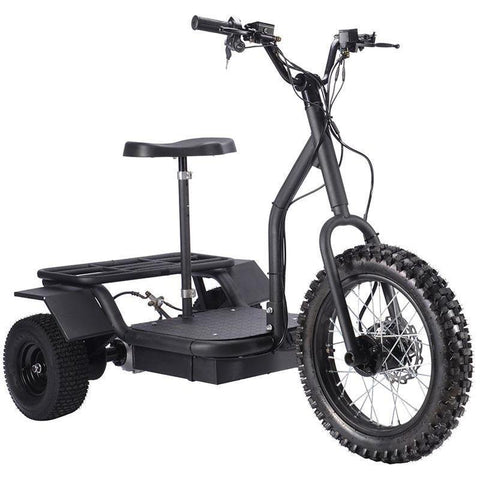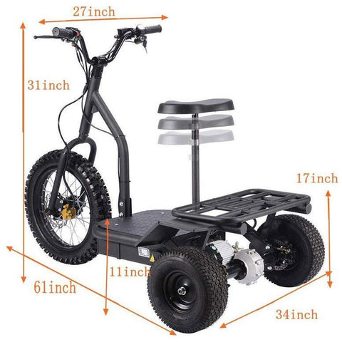 The MotoTec Transportation 3-Wheel Mobility Scooter measures 62” L x 34” W x 46” H and weighs 216 lbs. The bike is equipped with hydraulic front and rear disc brakes and a low-rise padded mini-seat.