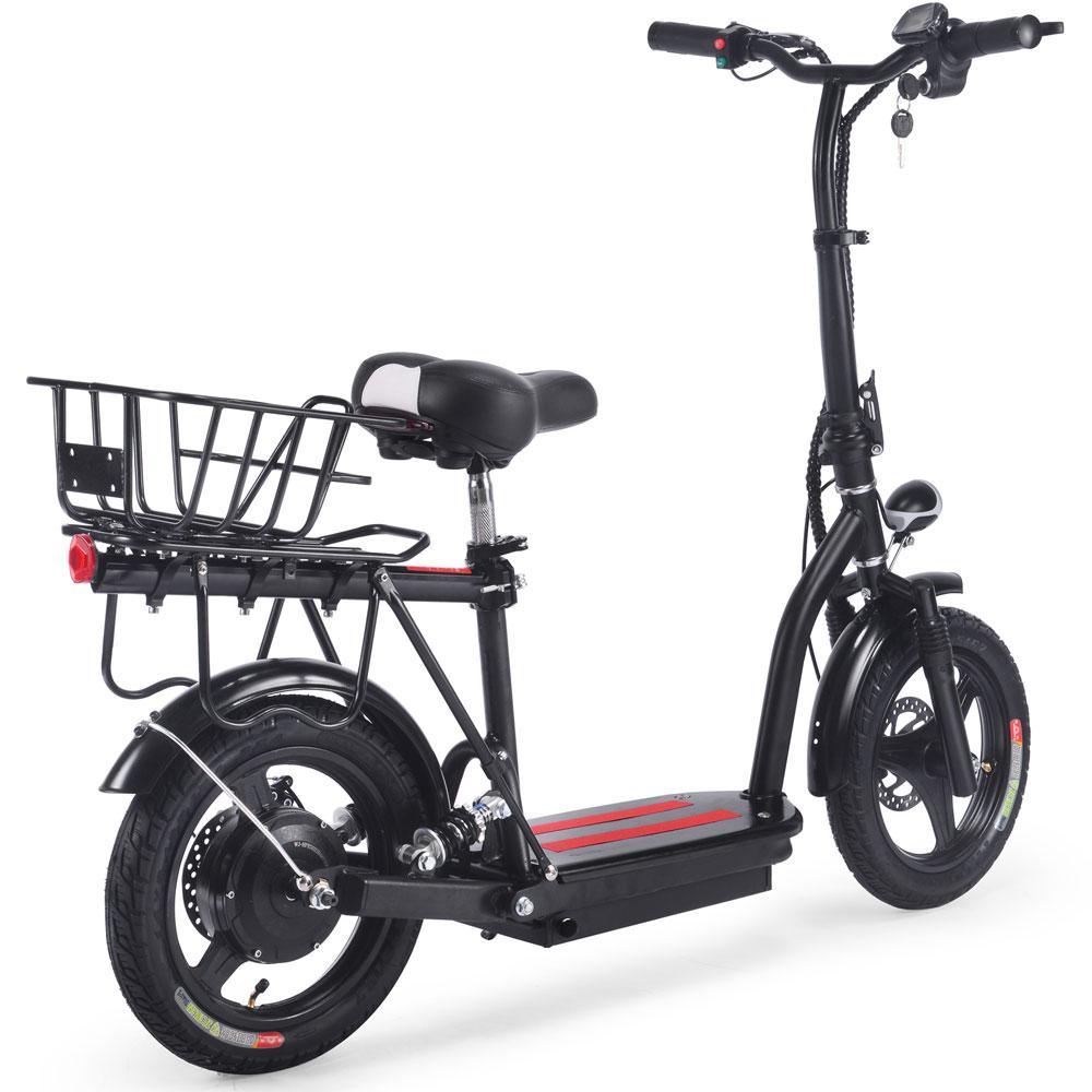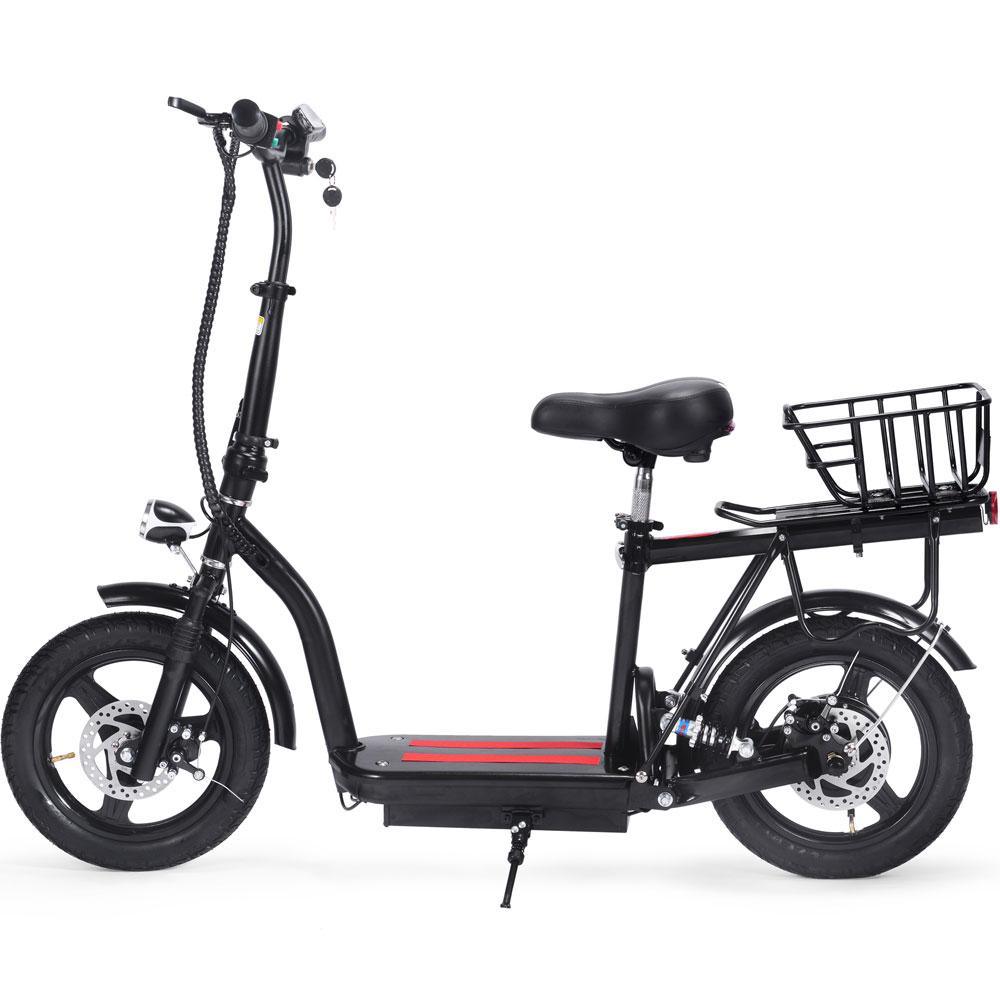 The MotoTec Cruiser Scooter features a gorgeous bare metal frame with a low deck. It comes with a headlight, a rear basket for luggage, and a comfortable saddle perfect for leisure and commuting. It features a folding handlebar tiller that makes storage and parking easy.