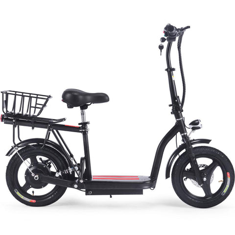 • The MotoTec Cruiser Scooter features a gorgeous bare metal frame with a low deck. It comes with a headlight, a rear basket for luggage, and a comfortable saddle perfect for leisure and commuting. It features a folding handlebar tiller that makes storage and parking easy.