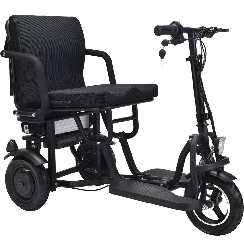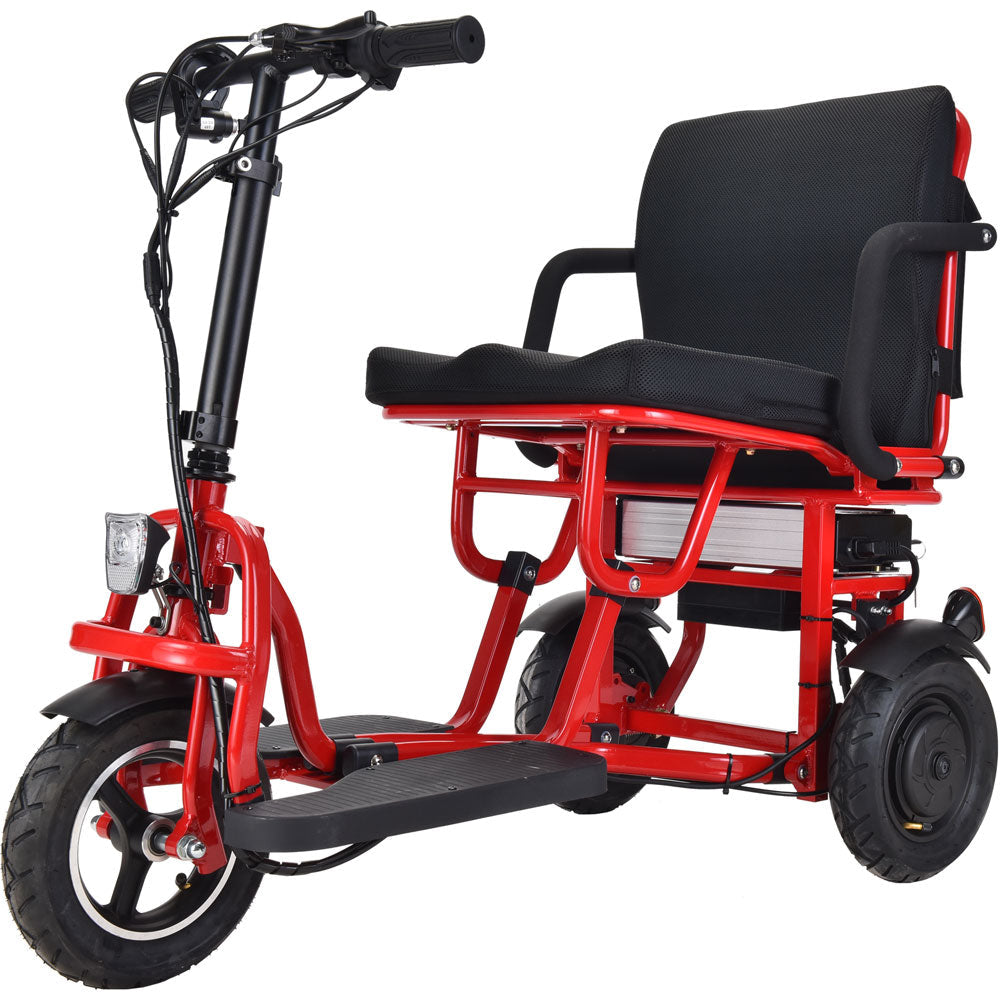 Introducing the new Folding Mobility Scooter by MotoTec. Its compact, three wheel styling makes for a sharp turning radius, 2 hub motors built into the rear wheels provide amazing torque for riding up inclines with its lightweight durable frame made from Aluminum. The lithium battery is lightweight and lasts longer than your standard lead acid competing models. Comes standard with headlight, rear reflectors, key start, reverse, dual rear drum brakes, comfortable seat with backrest, carrying bag and large 10 inch air filled tires to provide a comfortable ride.