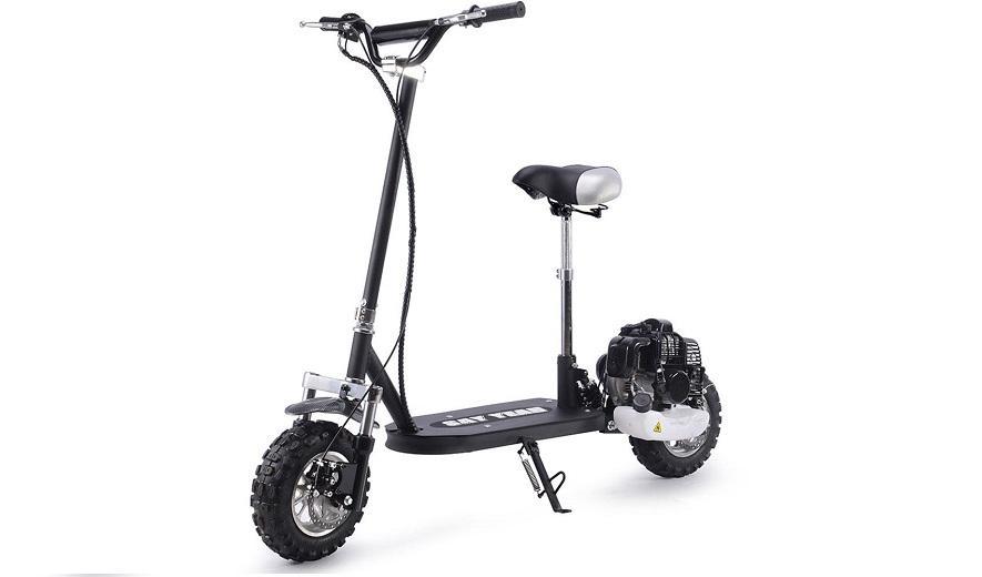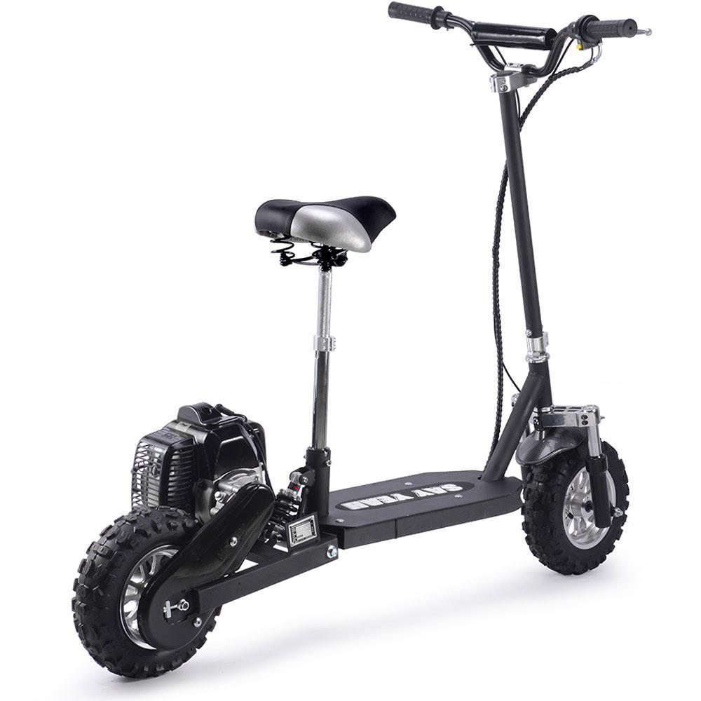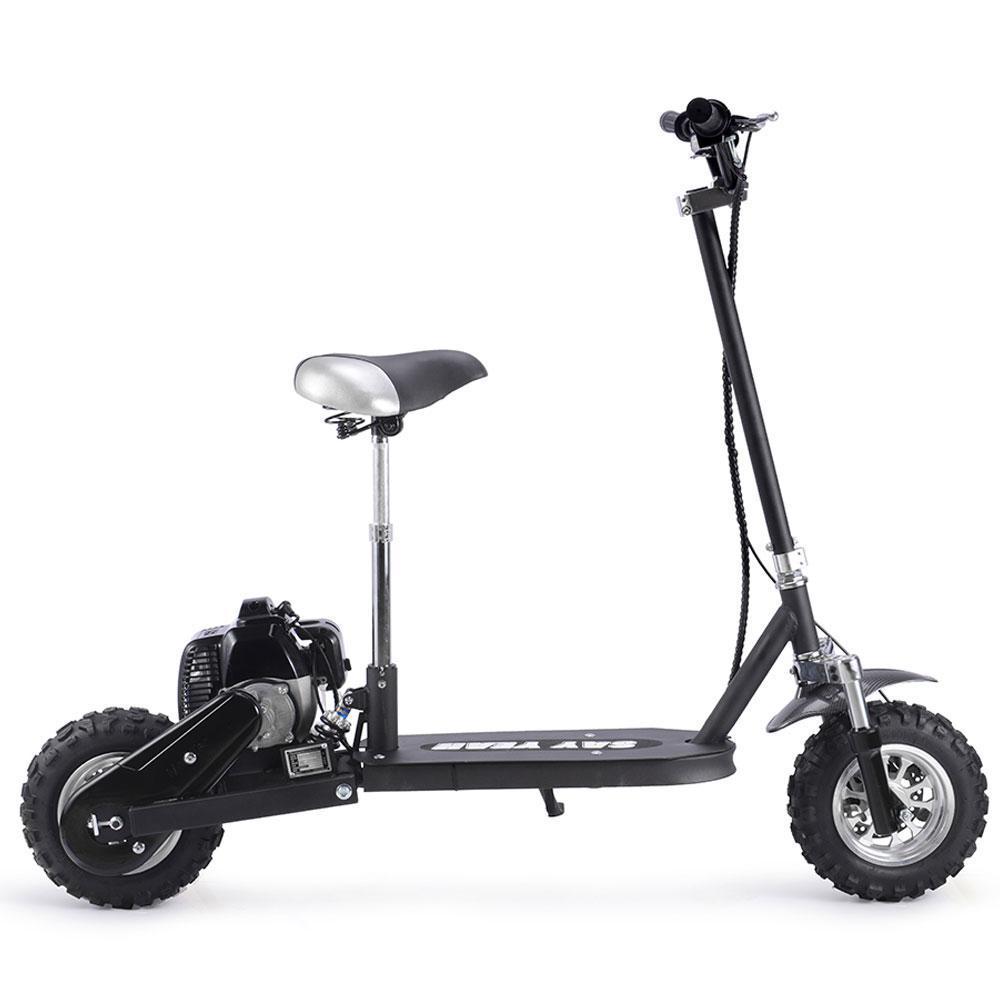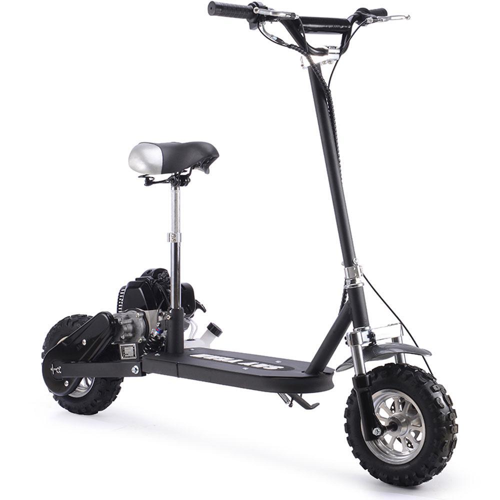 The MotoTec 49cc Gas Scooter SY-Gas-Scooter-49cc_Black is the ultimate kid ride! Great for driveway and a parking lot fun, cruise around cones, and speed through trails with ease. Comes standard with front & rear disc brakes, 11-inch knobby pneumatic dirt tires, front & rear shock, and a removable seat.