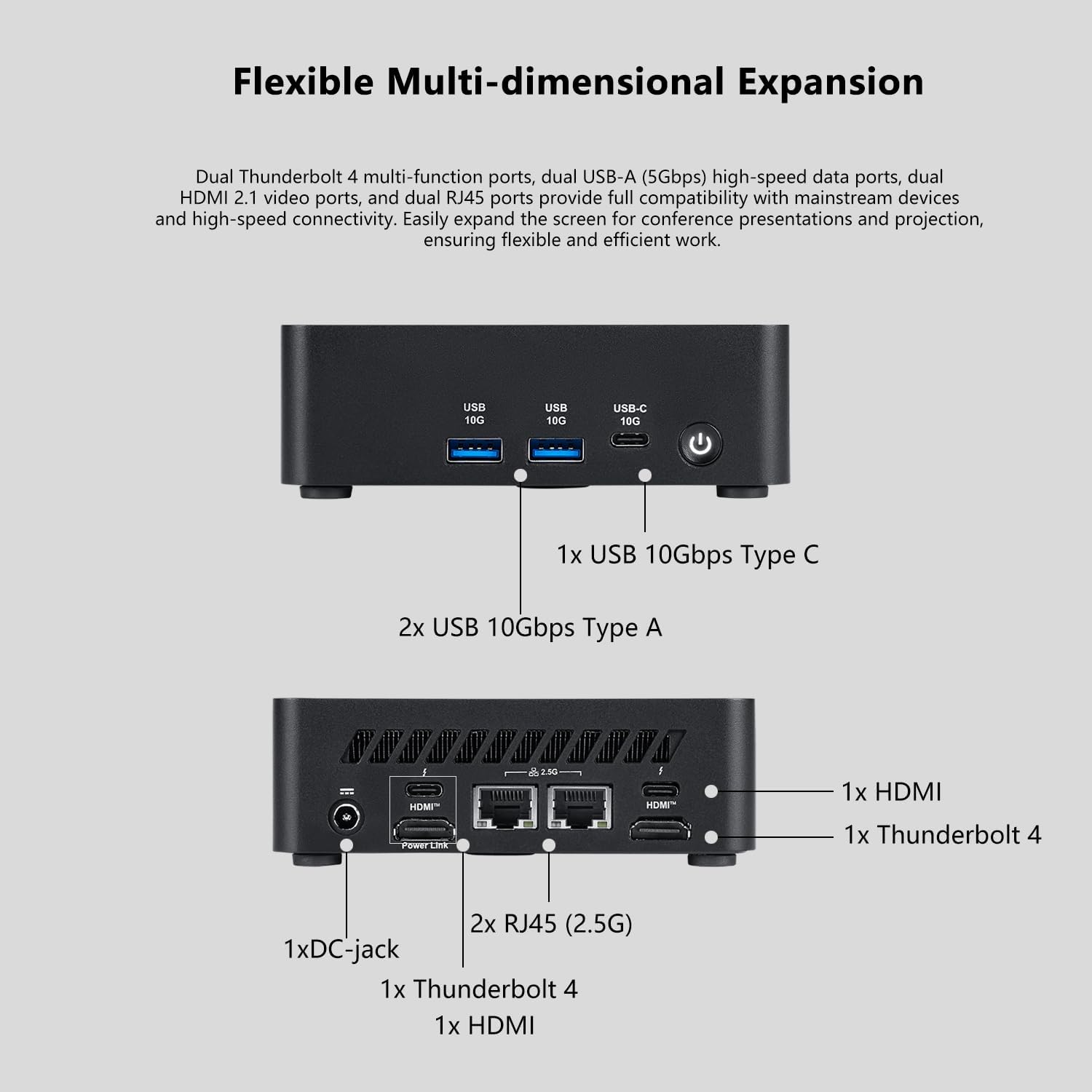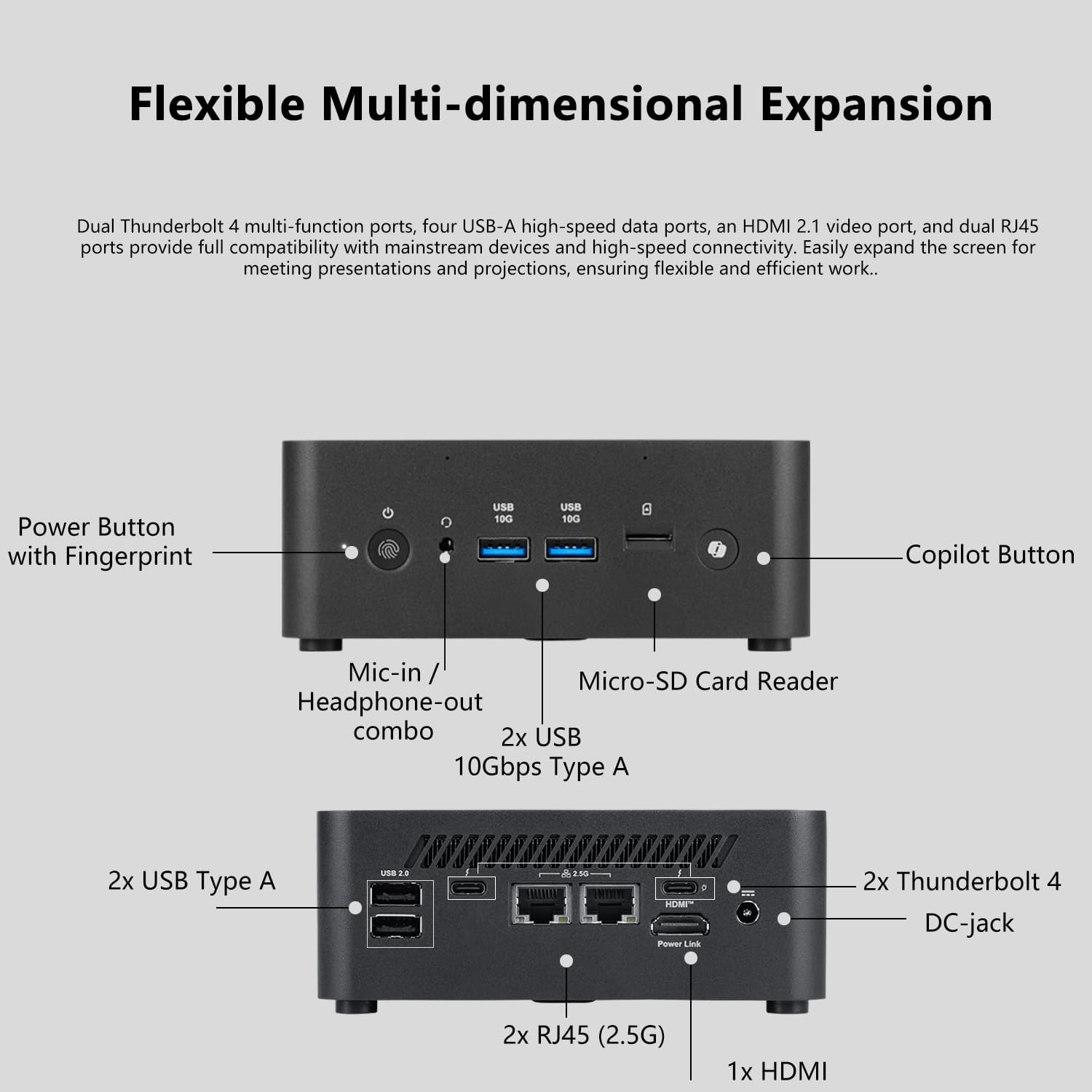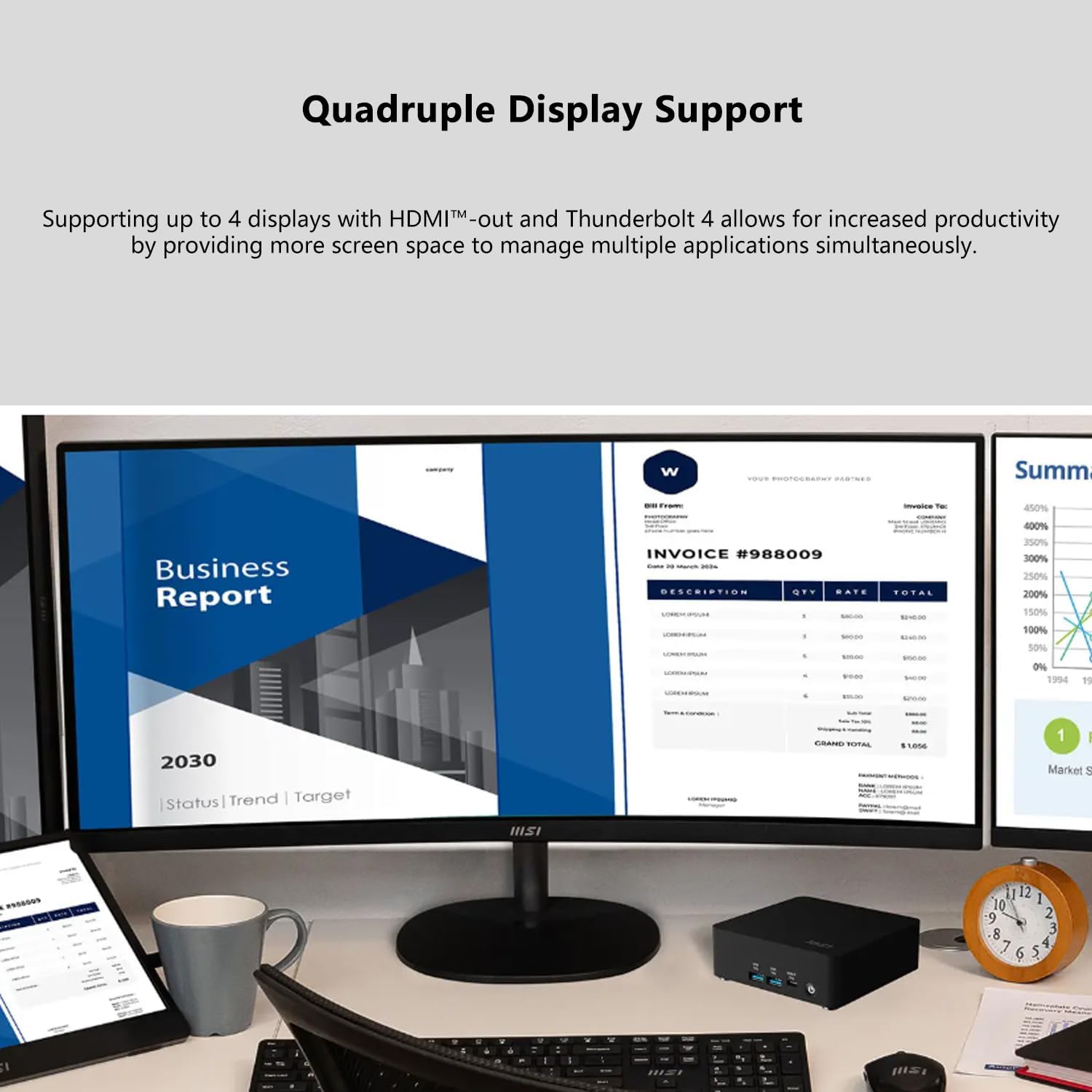 - [Quad Display Support] 1x USB 10Gbps Type C, 2x USB 10Gbps Type A, 2x Thunderbolt 4, 2x RJ45 (2.5G), 2x HDMI, 1x Kensington Lock, 1x External Power Switch Pin Header, Wi-Fi 6E and Bluetooth, perfect for professionals who need expanded screen space for trading dashboards, development environments, or creative tasks.