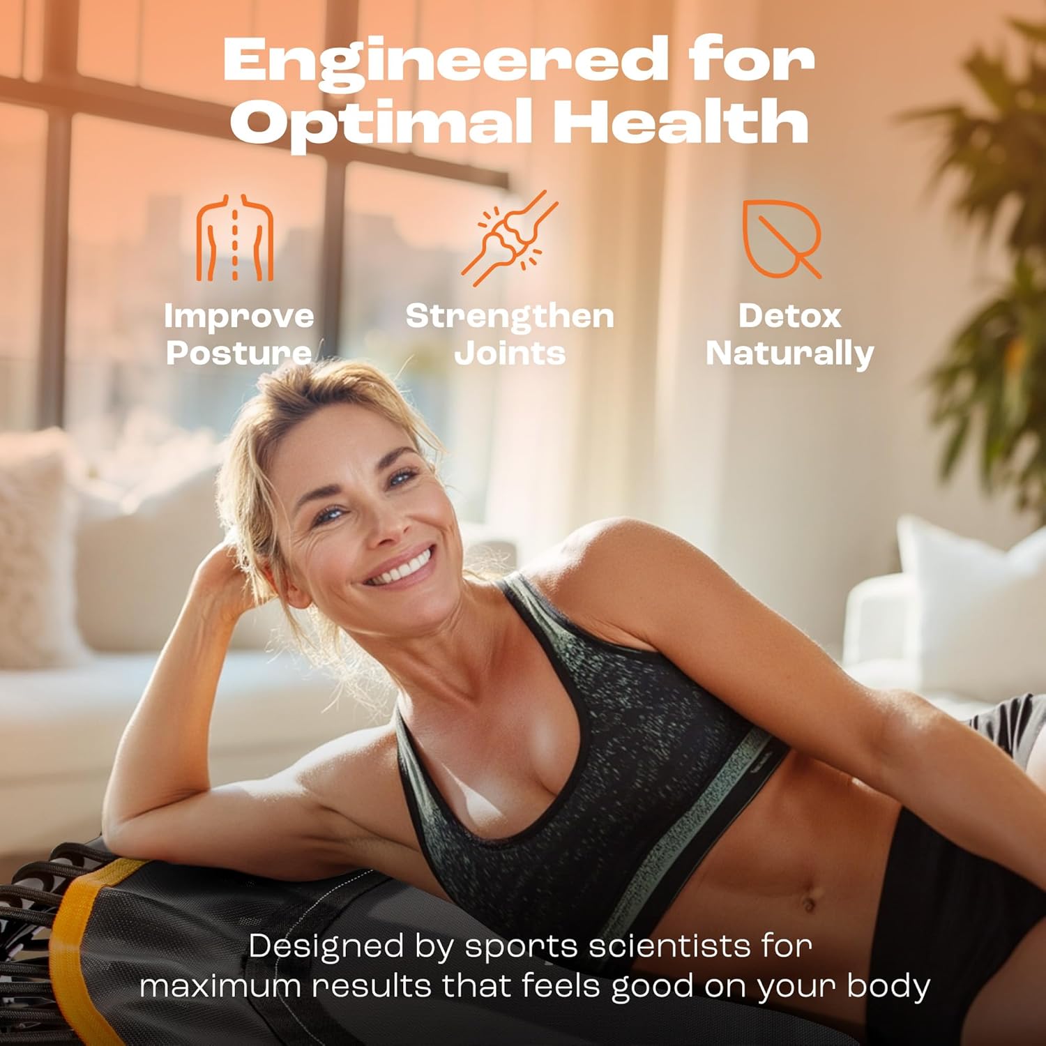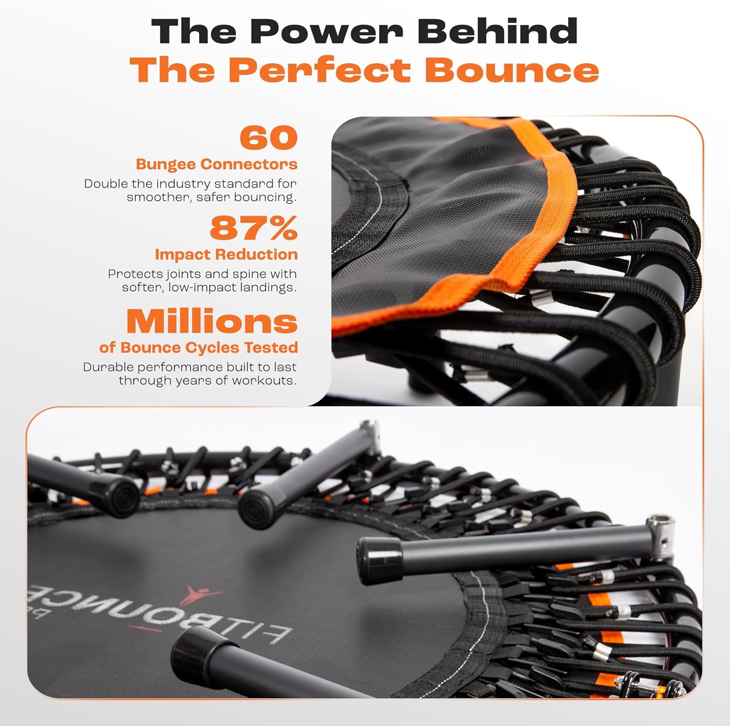 • Silent, Low-Impact Bounce: Features a mega-strong bungee rebounder system with 60 connectors—twice as many as most rebounders—providing a gentle, joint-friendly bounce. Ideal for lymphatic drainage, muscle toning, posture improvement, and safe low-impact cardio at home.