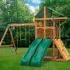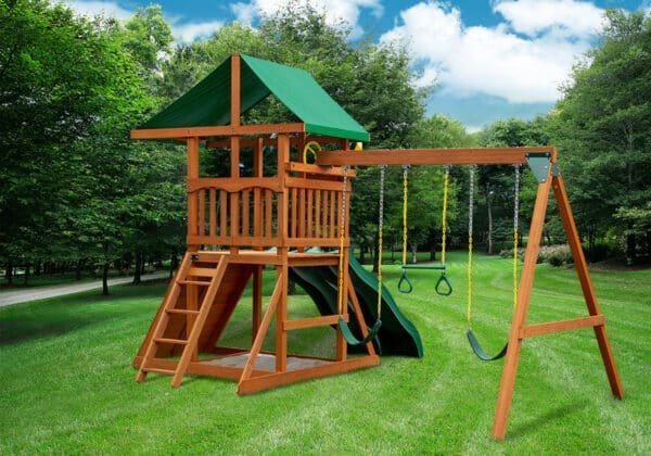 Speed to the finish line with the Outing Wood Swing Set with Vinyl Canopy and Yellow Dual Slides by Gorilla Playsets. This charming playset includes two side-by-side yellow Alpine Wave Slides so kids can compete in friendly races. The Outing Swing Set also features two extreme-duty swing belts, a trapeze bar assembly, a built-in sandbox area, and so much more. The Green Deluxe Vinyl Canopy protects the play deck from the elements and provides a shady spot on sunny days. This swing set includes all required hardware, all lumber, and a step-by-step instruction manual to reduce assembly time. The lumber comes pre-sanded, pre-cut, and pre-stained at the factory. Even the main beams come pre-drilled to cut back on building time. Gorilla Playsets’ cedar lumber naturally resists rot, decay, and insect damage. We recommend using a sealant, like our Playground Sealant, within the first 90 days to keep your swing set looking nice and help prolong the life of the play system. Order your Outing Wood Swing Set with Vinyl Canopy and Dual Slides today and race to the finish line!