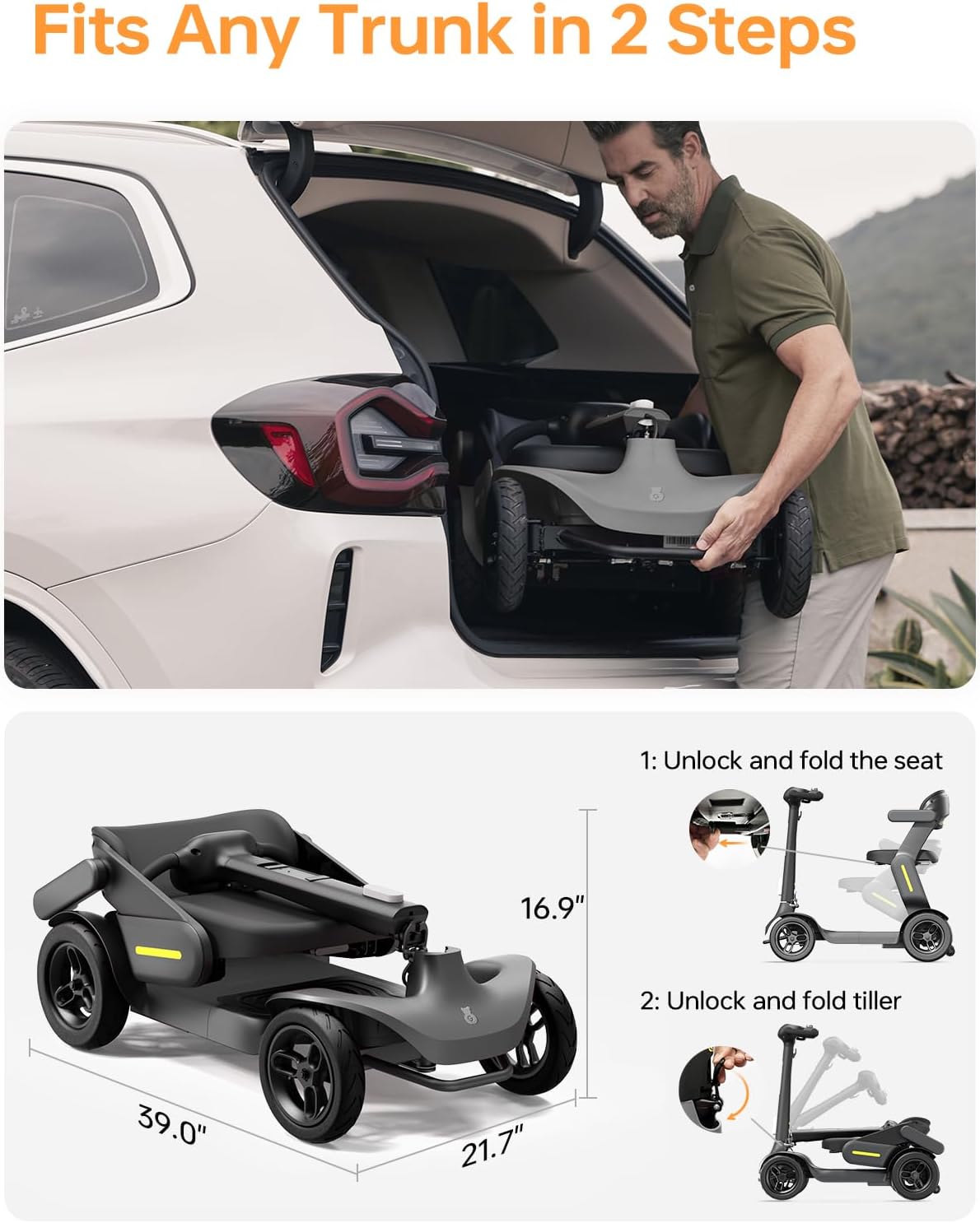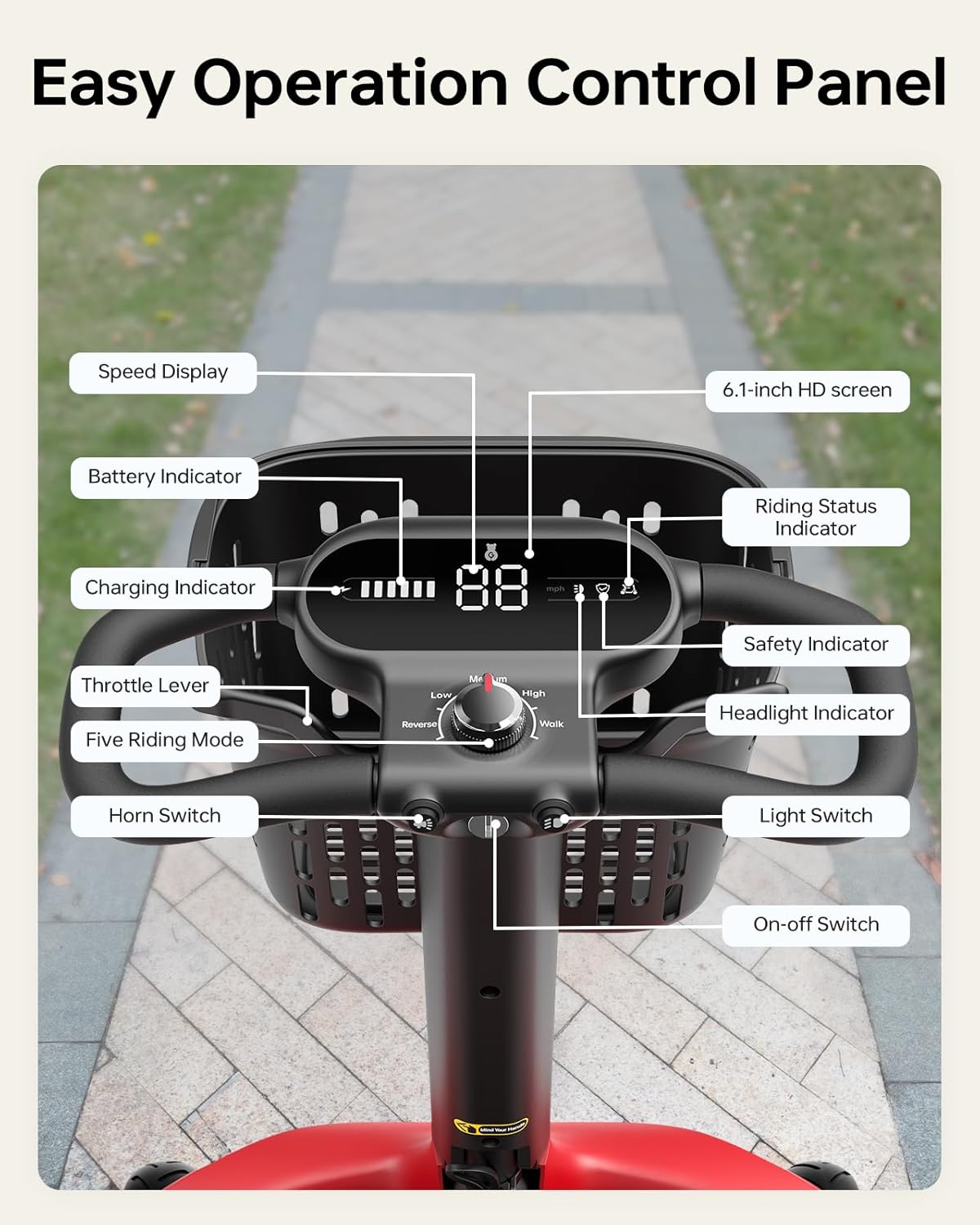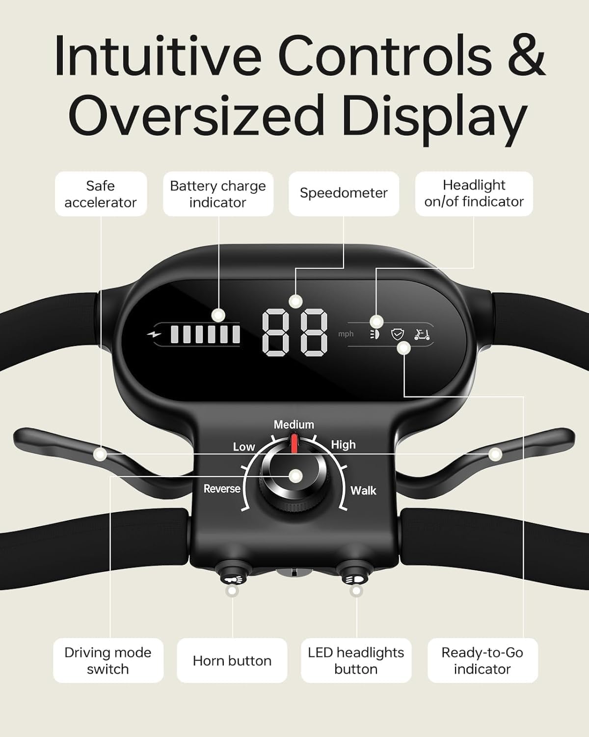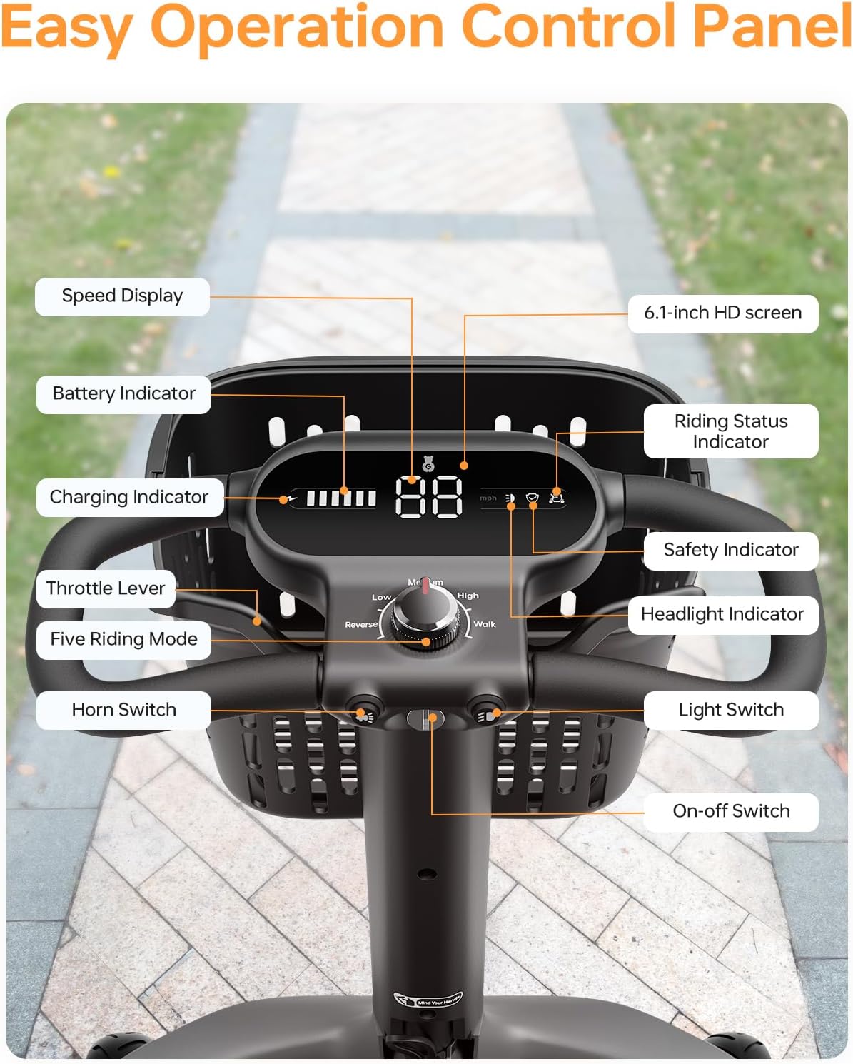• Customizable Comfort: 6.1-inch HD display shows battery, speed, and lights. Adjustable tiller, foldable/expandable armrests, and thick cushioned seat provide ergonomic, long-distance comfort.
