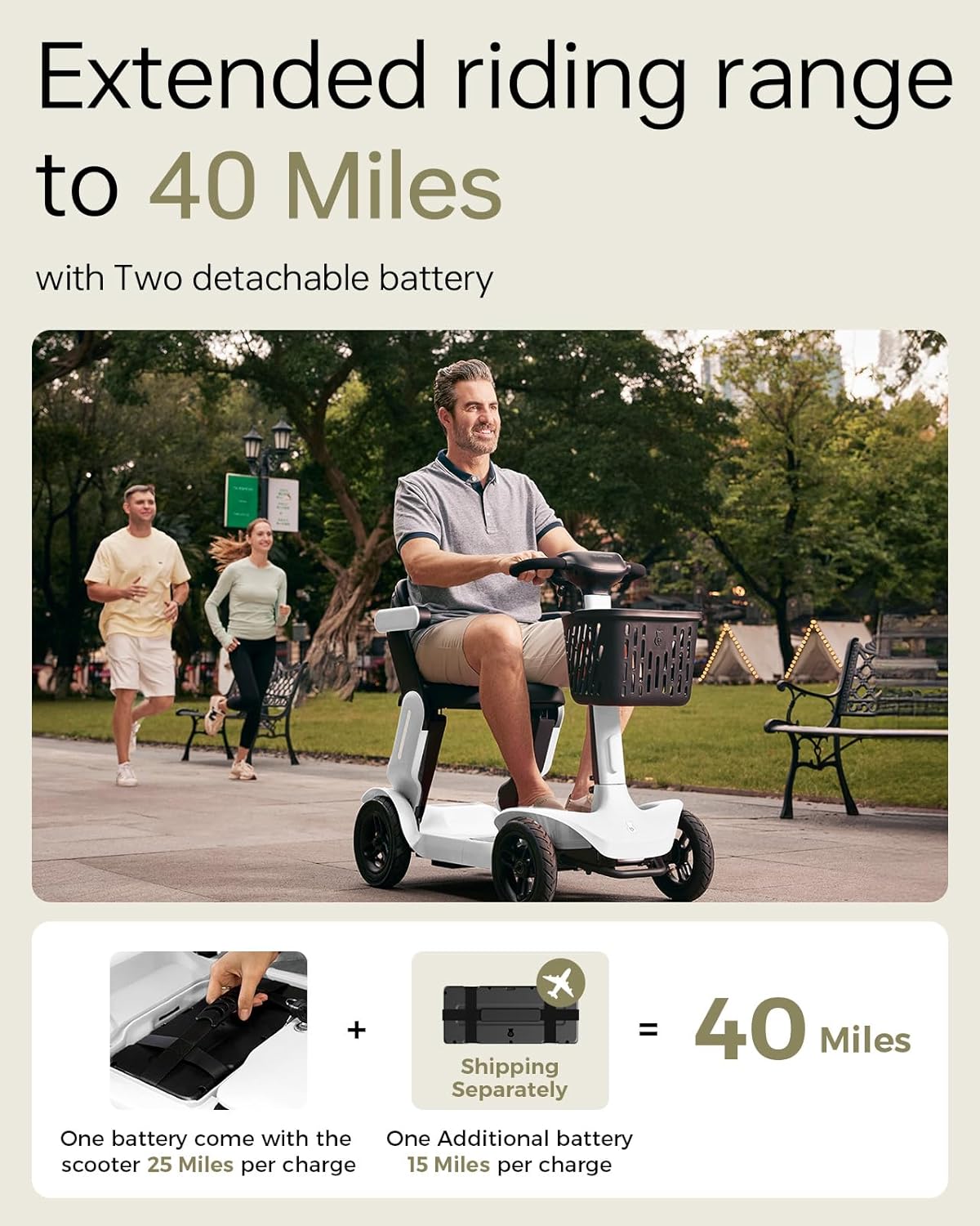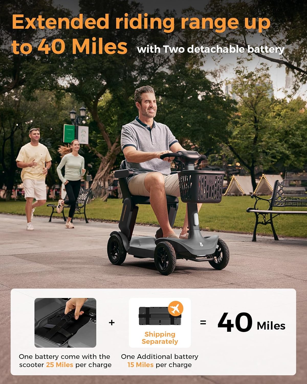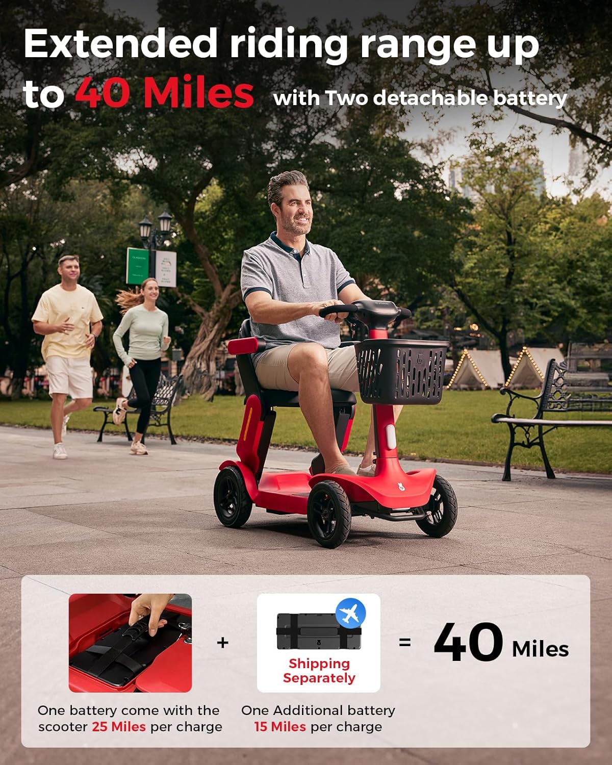 • Extended Range & Dual Battery: Up to 40 miles per charge with two powerful detachable lithium batteries. Additional battery is airline-approved, perfect for travel.