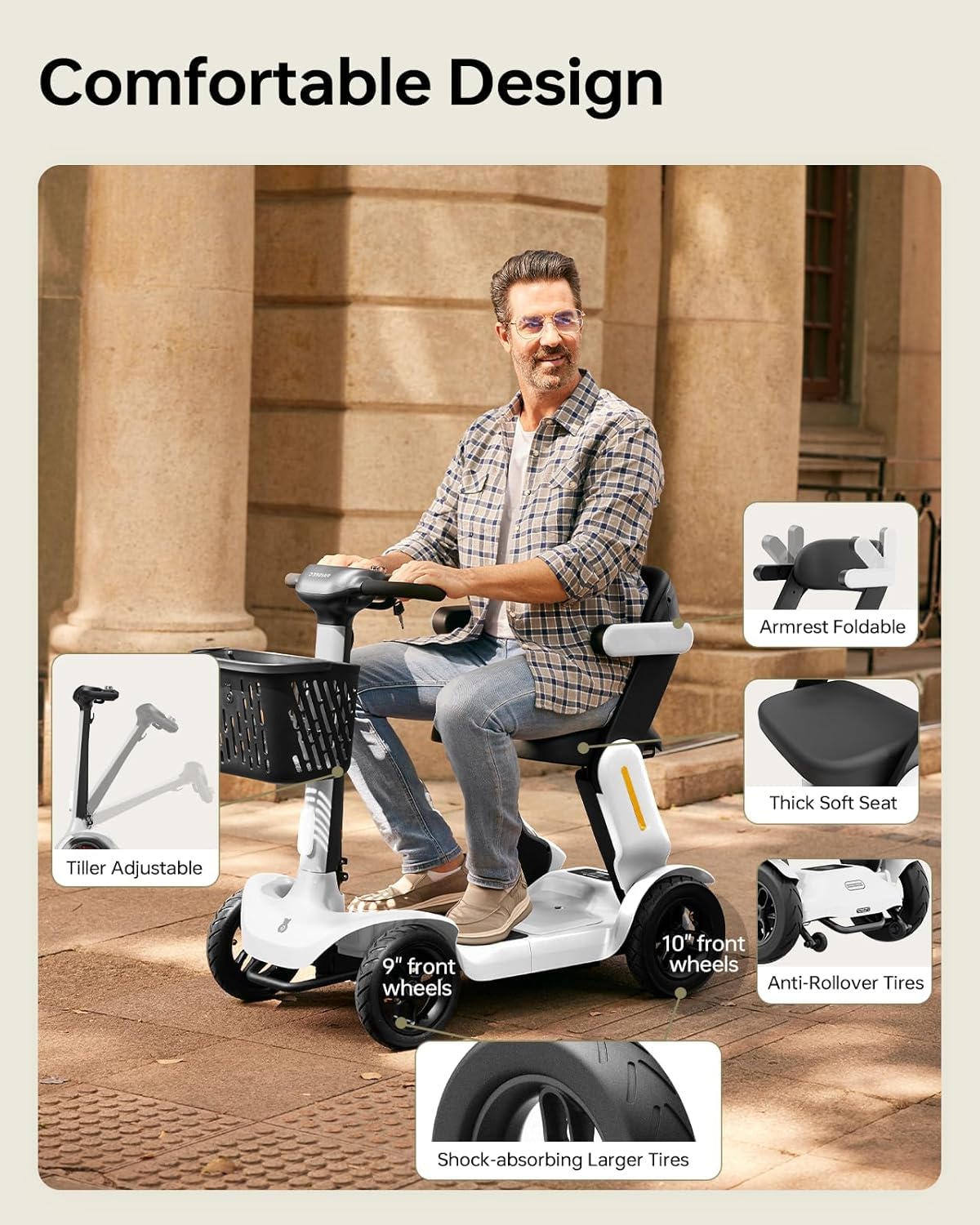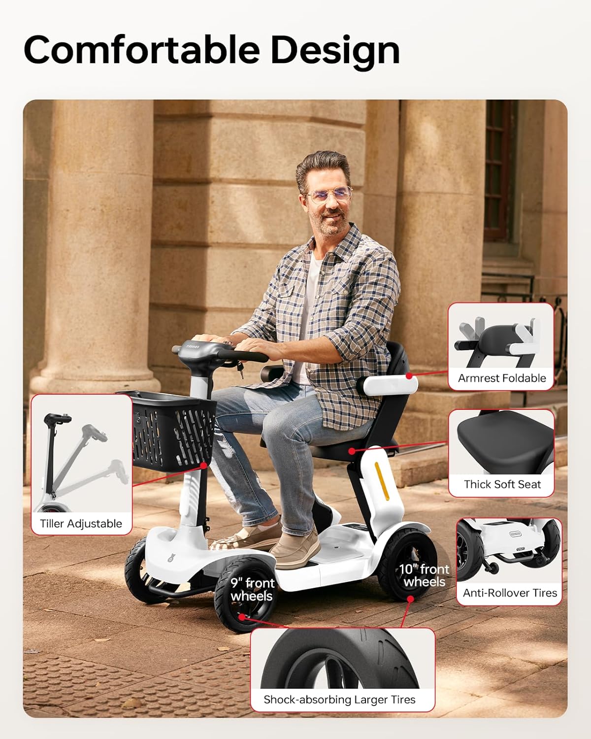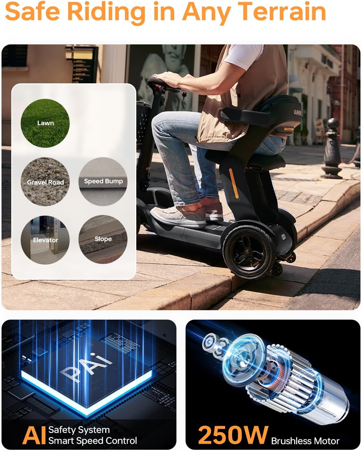 • All-Terrain Performance: 250W brushless motor, 9″ front air-filled shock-absorbing wheels, and 10″ rear wheels for stable rides on grass, concrete, or rocky surfaces. Supports up to 300 lbs.