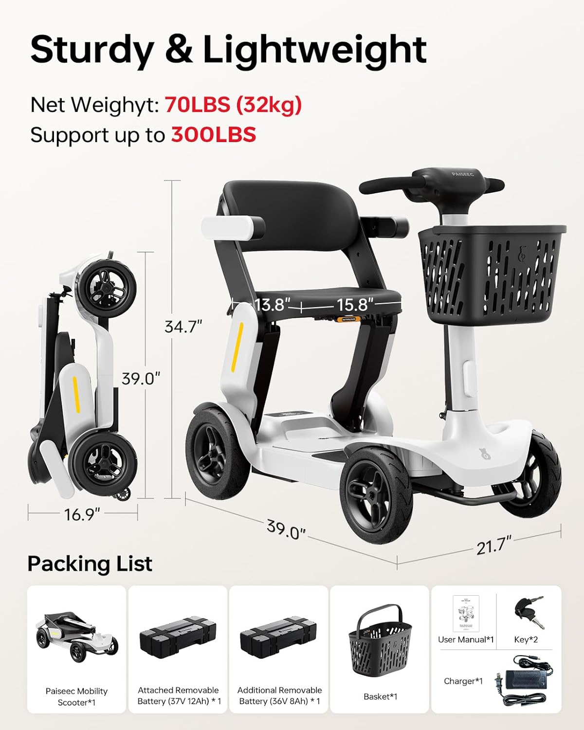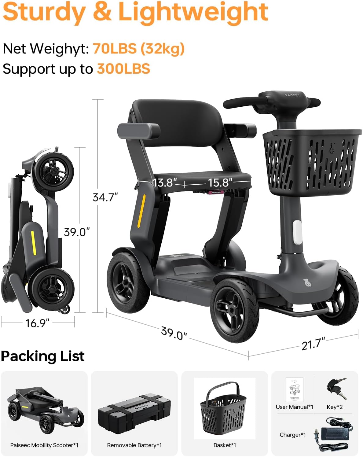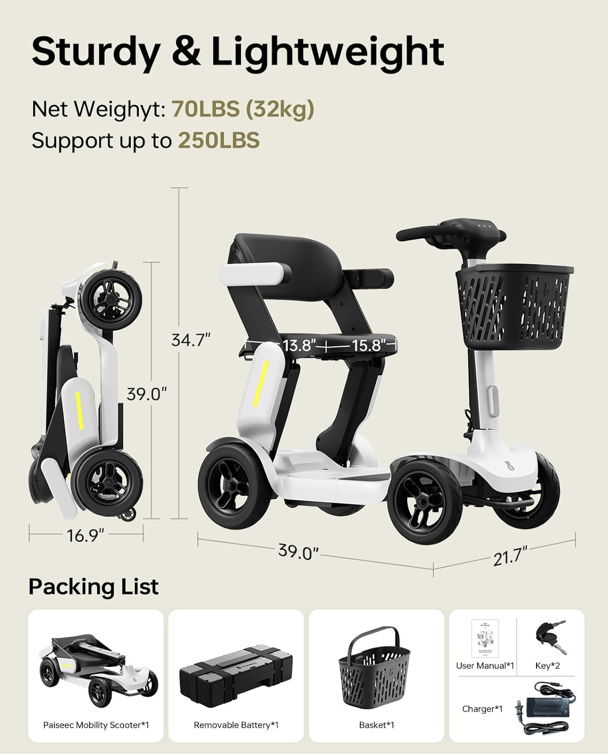Paiseec S3 Pro Foldable 4-Wheel Mobility Scooter for Seniors, 40 Mile Range, 250W, All-Terrain