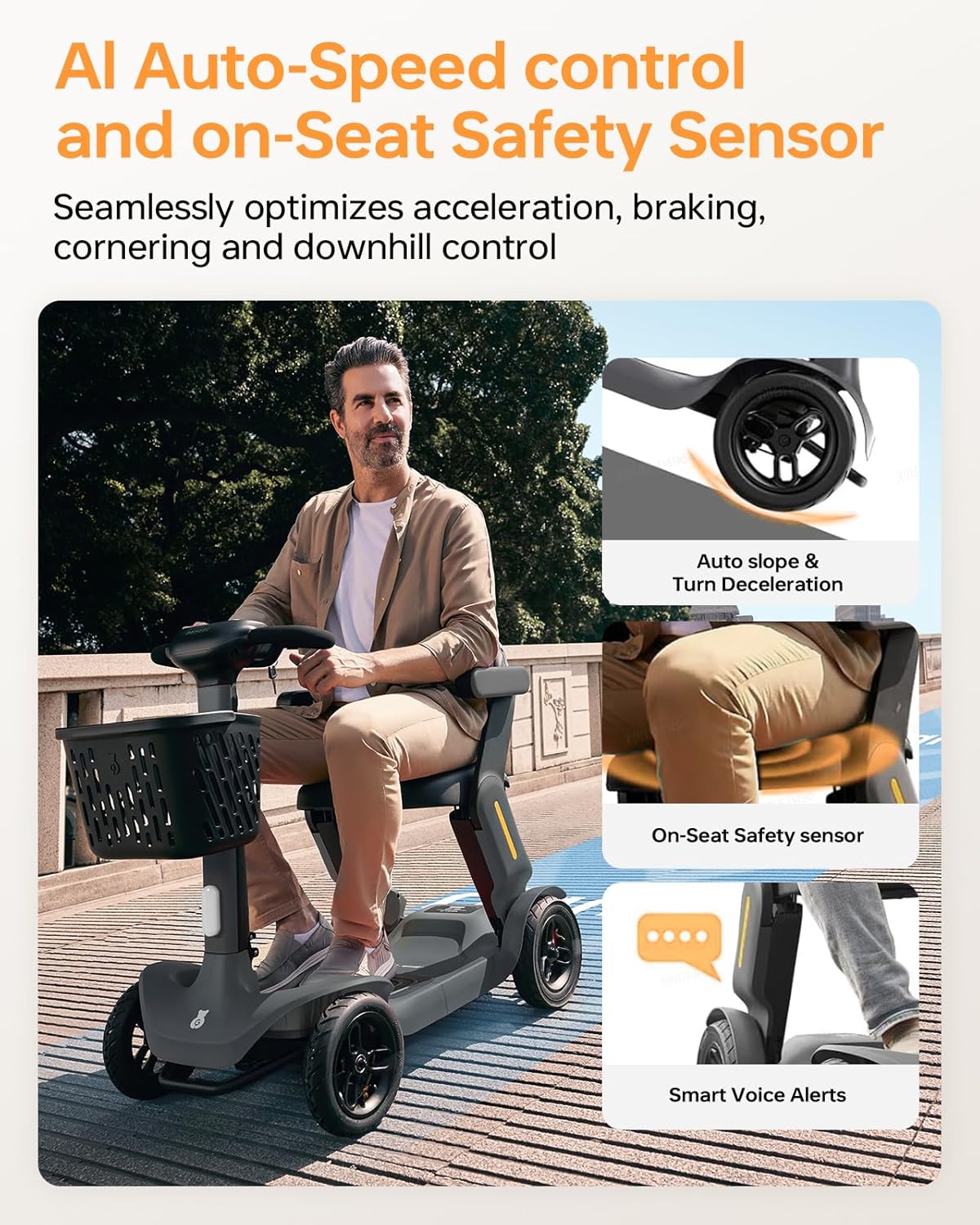 • AI Safety System: Auto speed control ensures smooth and safe acceleration, steering, and downhill rides. Intelligent AI voice alerts warn of hazards, low battery, and excessive speed.
