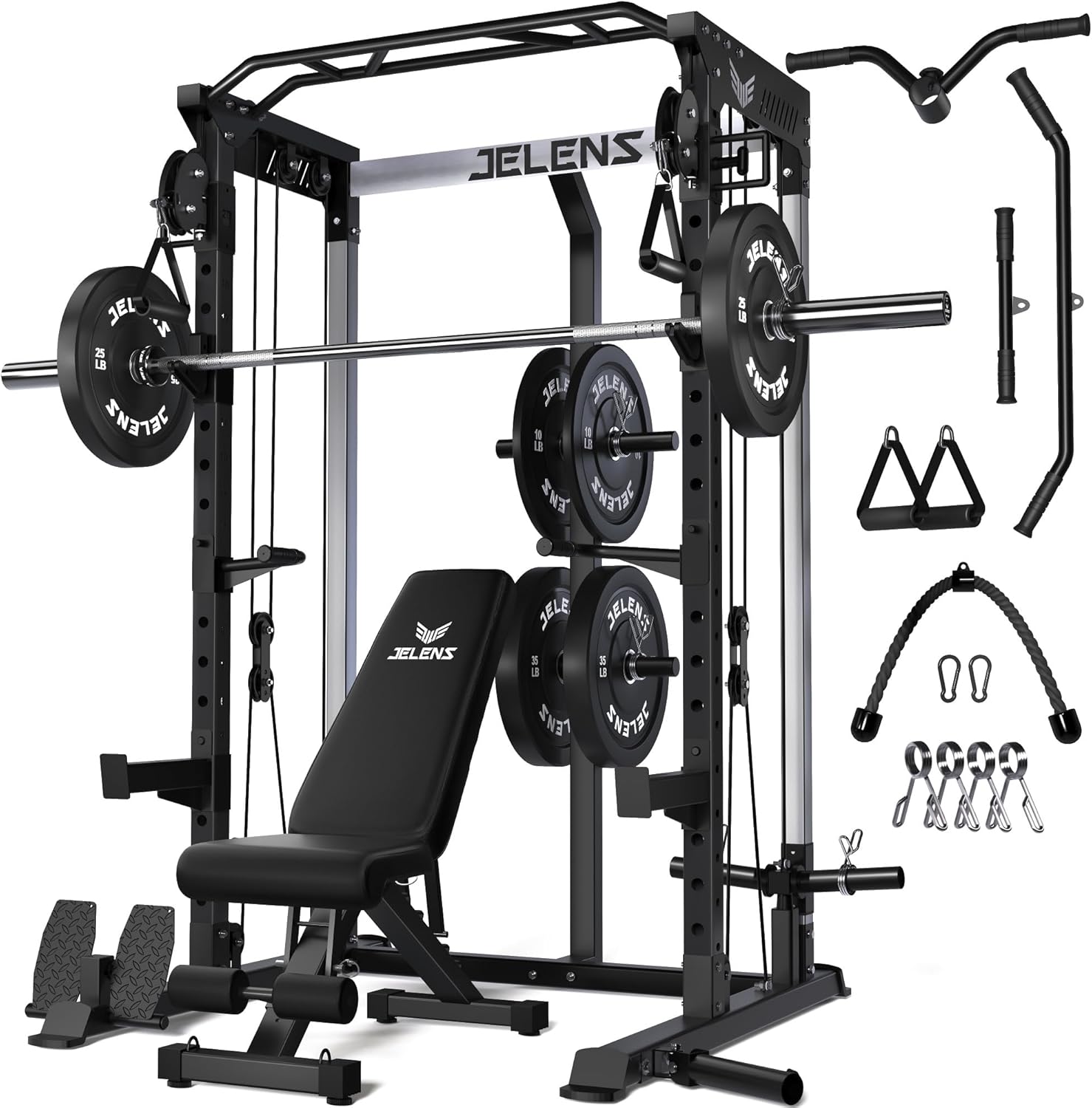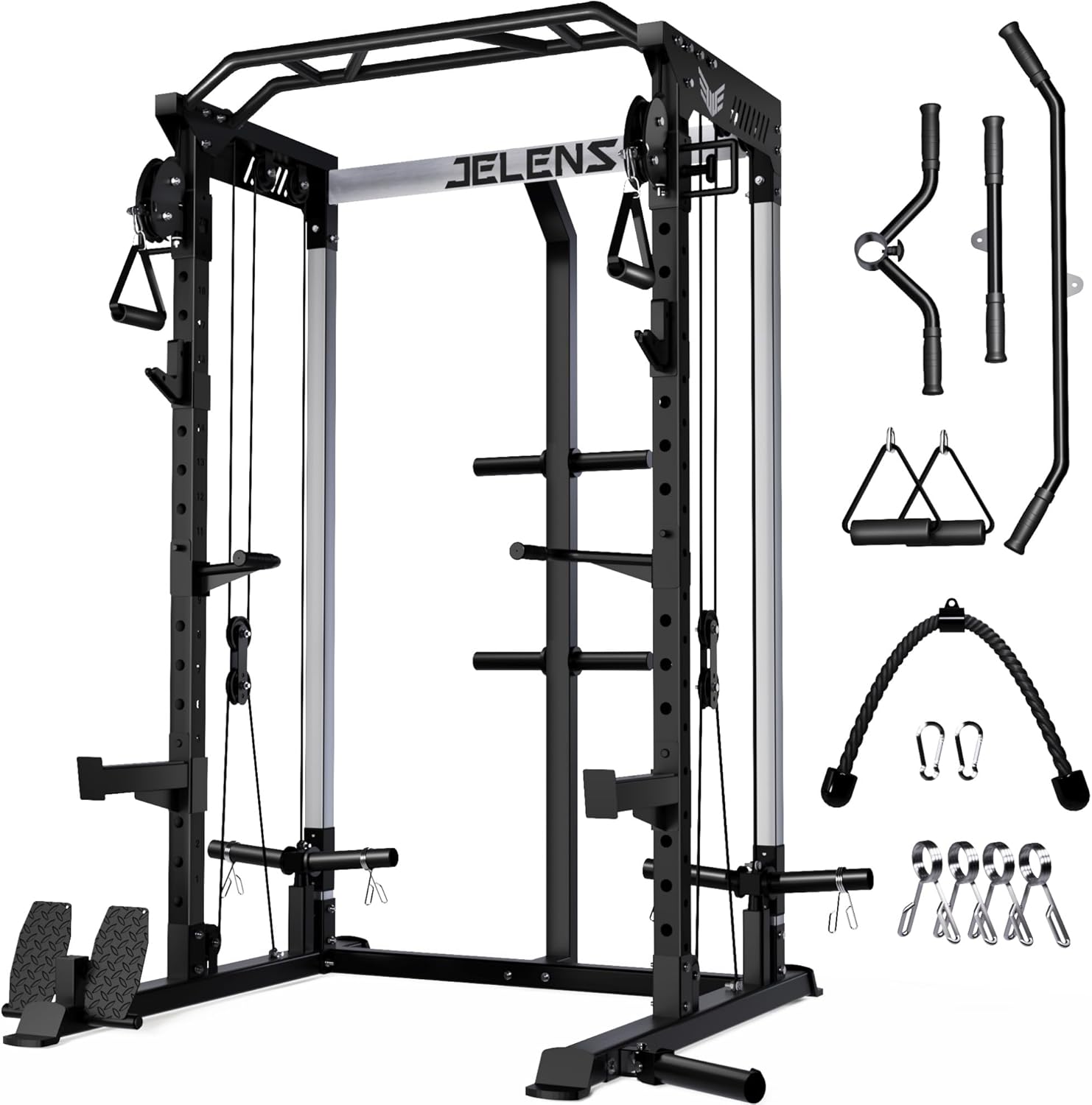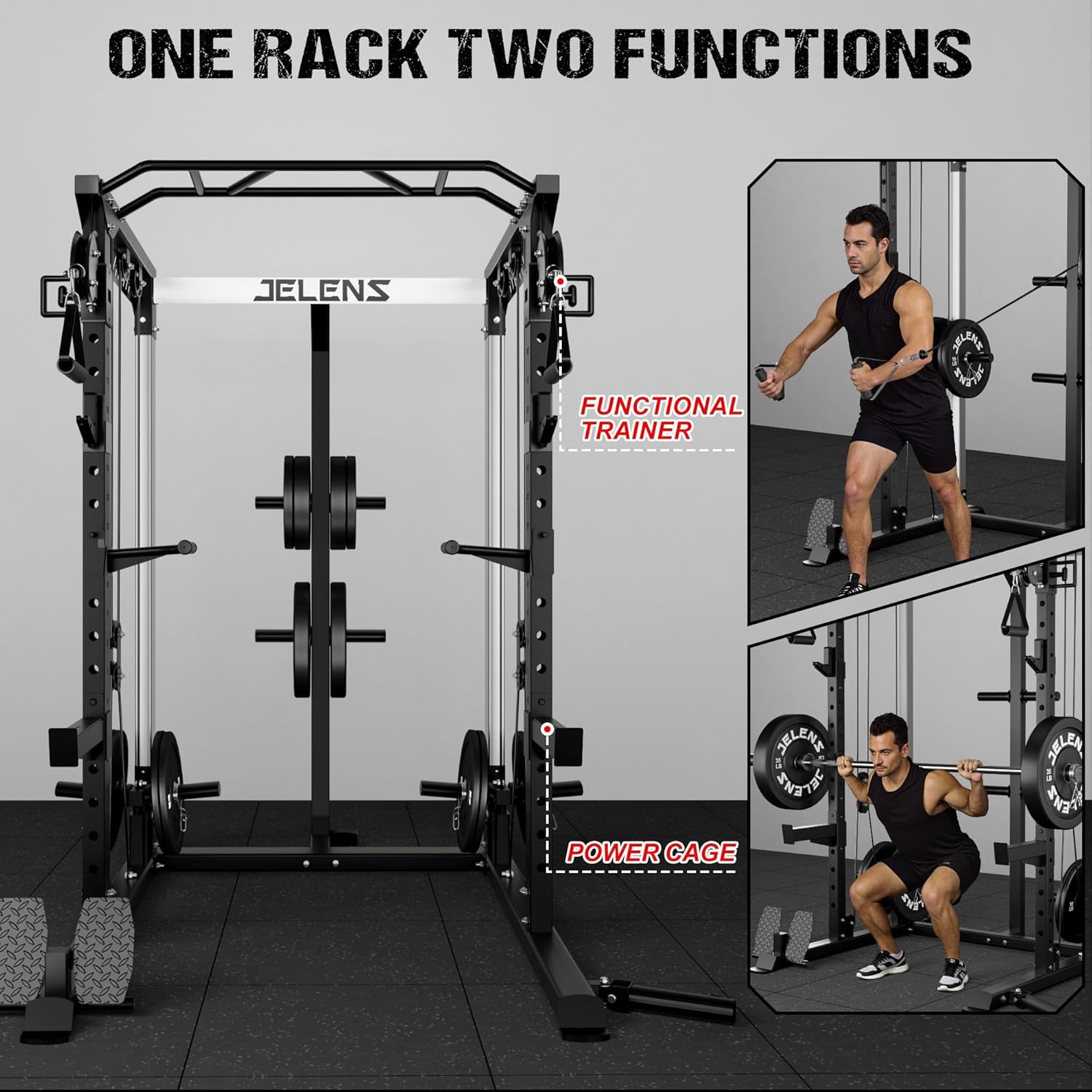 Transform your home gym with a single machine. The JELENS C21 squat rack allows for a wide range of exercises: bench presses, squats, seated rows, pull-ups, triceps extensions, and 360° landmine moves. Perfect for beginners and athletes alike, it offers unlimited training options in a compact space.