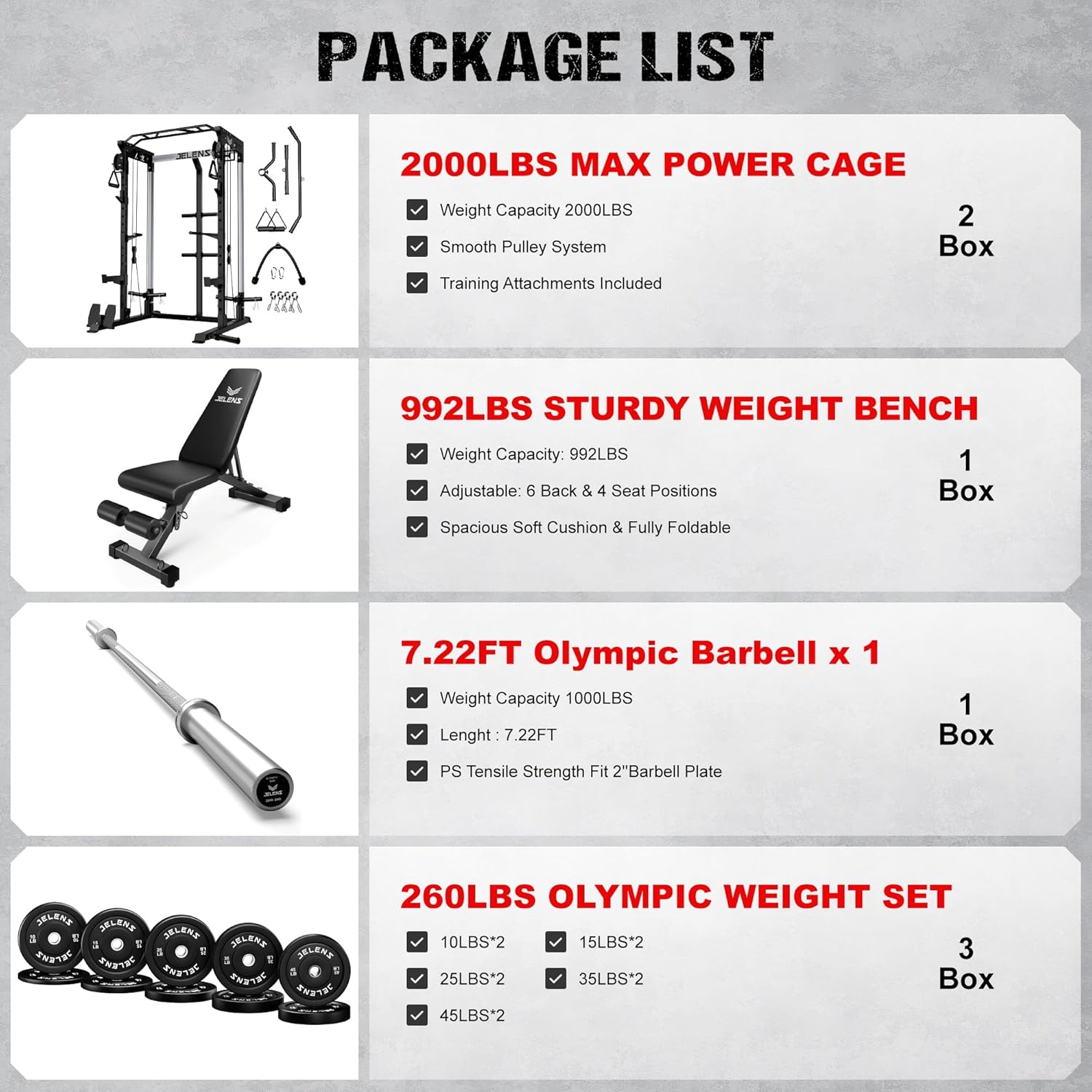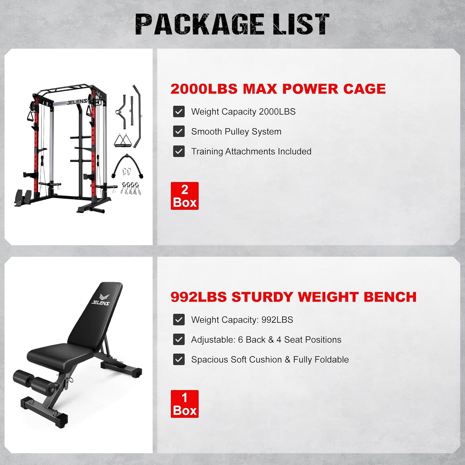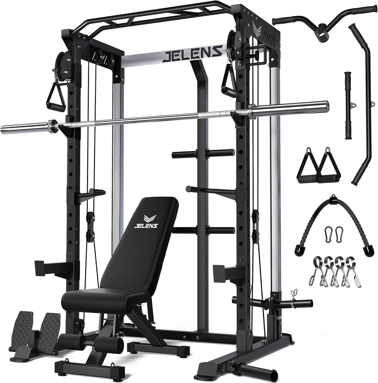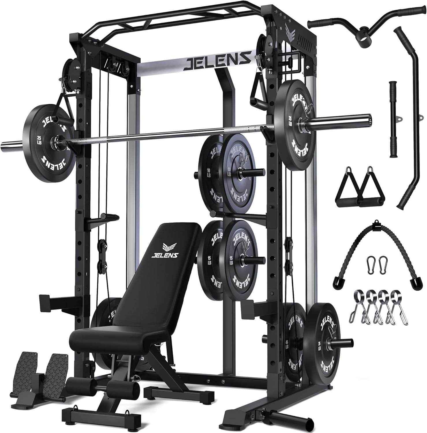 Transform your home gym with a single machine. The JELENS C21 squat rack allows for a wide range of exercises: bench presses, squats, seated rows, pull-ups, triceps extensions, and 360° landmine moves. Perfect for beginners and athletes alike, it offers unlimited training options in a compact space.
