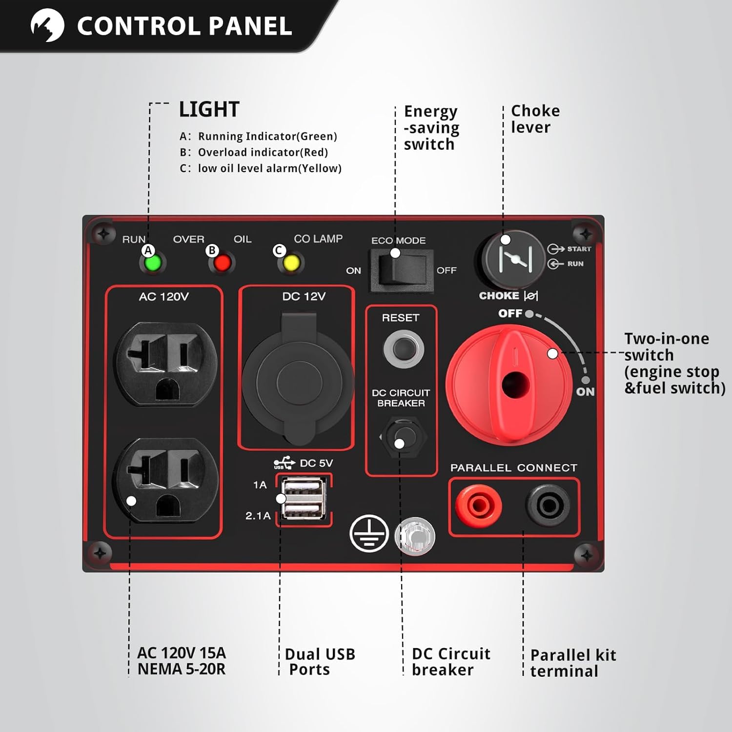 • Enhanced Safety Features – Powered by an EPA-compliant 223cc 4-stroke engine with built-in CO detection, low-oil shutdown, and overload protection for safe, reliable operation.