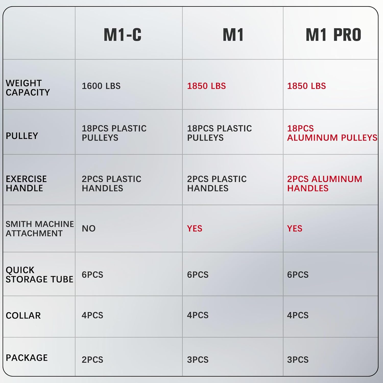 The dual-slide rail cable crossover system features aluminum pulleys (plastic pulleys used for 1.0), premium rubber cables, and stainless steel composite materials for smooth and durable operation. Perform exercises such as low, mid, and high crossovers, chest press, mid row, bent-over row, lat pushdowns, overhead triceps extensions, and more.