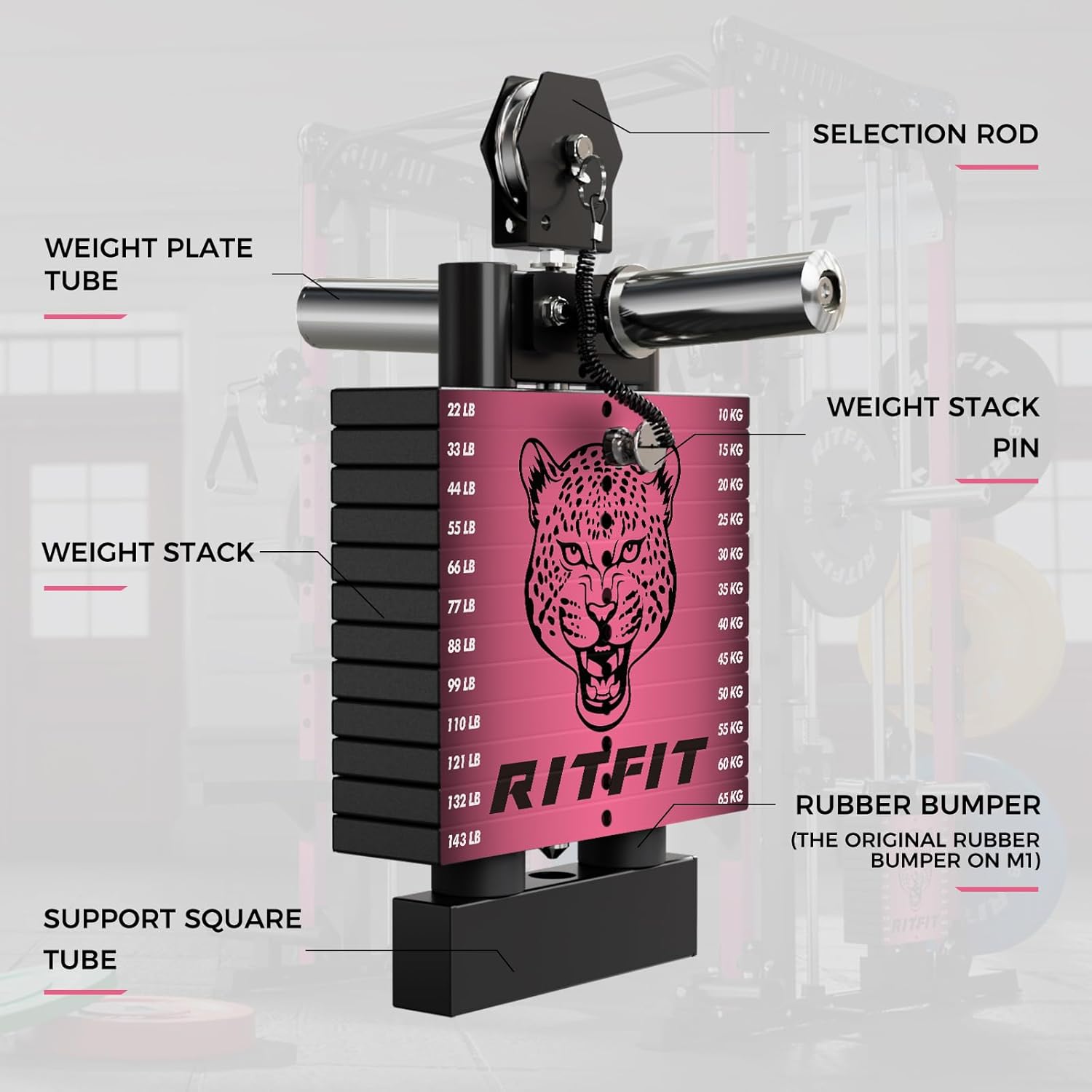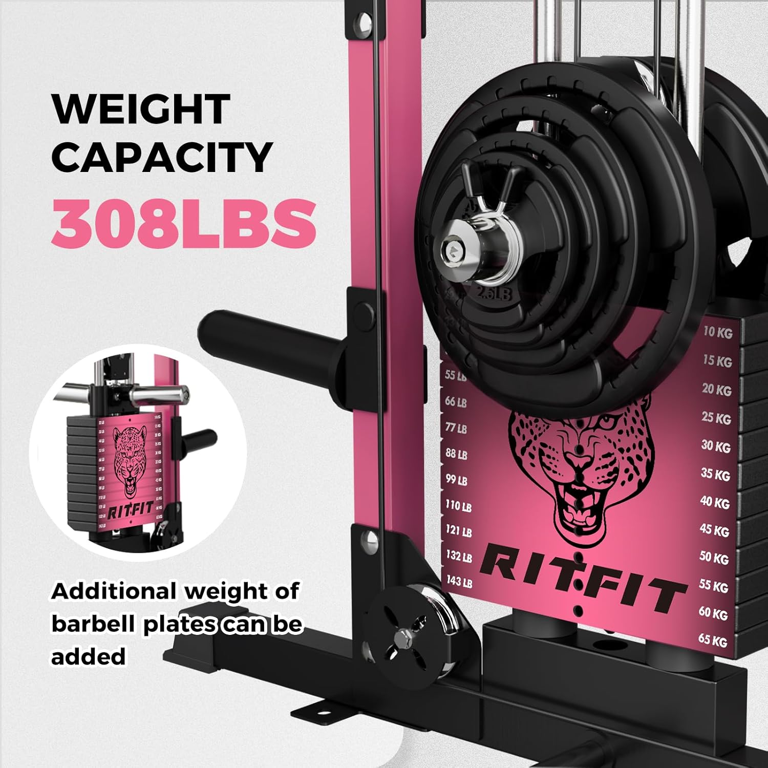 Built with heavy-duty 2”x2” steel uprights, the RitFit M1 Pro offers a safe and efficient strength training experience. Measuring 64.5″L x 68.1″W x 85.3″H, the machine provides ample exercise space. Its integrated design features linear bearings and a bottom spring shock absorption system, ensuring smooth, safe, and stable movement for all Smith machine exercises.