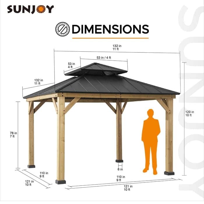 Expand your living space by bringing the indoors outside and creating your end-of-the-day oasis that’s the perfect spot for entertaining family and friends. This post-to-post size 10×10 gazebo by the world’s leading ready-to-assemble outdoor structure maker, Sunjoy, the 11×11 ft. steel roof creates the perfect outdoor setting for any time of the year. Spend all four seasons enjoying a covered spot outdoors under the cedar wood frame with a sturdy powder-coated steel rooftop that will stand the test of time. The 2-tier roof provides just the right amount of airflow while keeping occasional inclement weather at bay. Set the mood by suspending a chandelier from the incorporated ceiling hook for functional light and high design. With straightforward, easy-to-follow assembly instructions you’ll be relaxing with your beverage of choice in your favorite new outdoor living space for years to come.