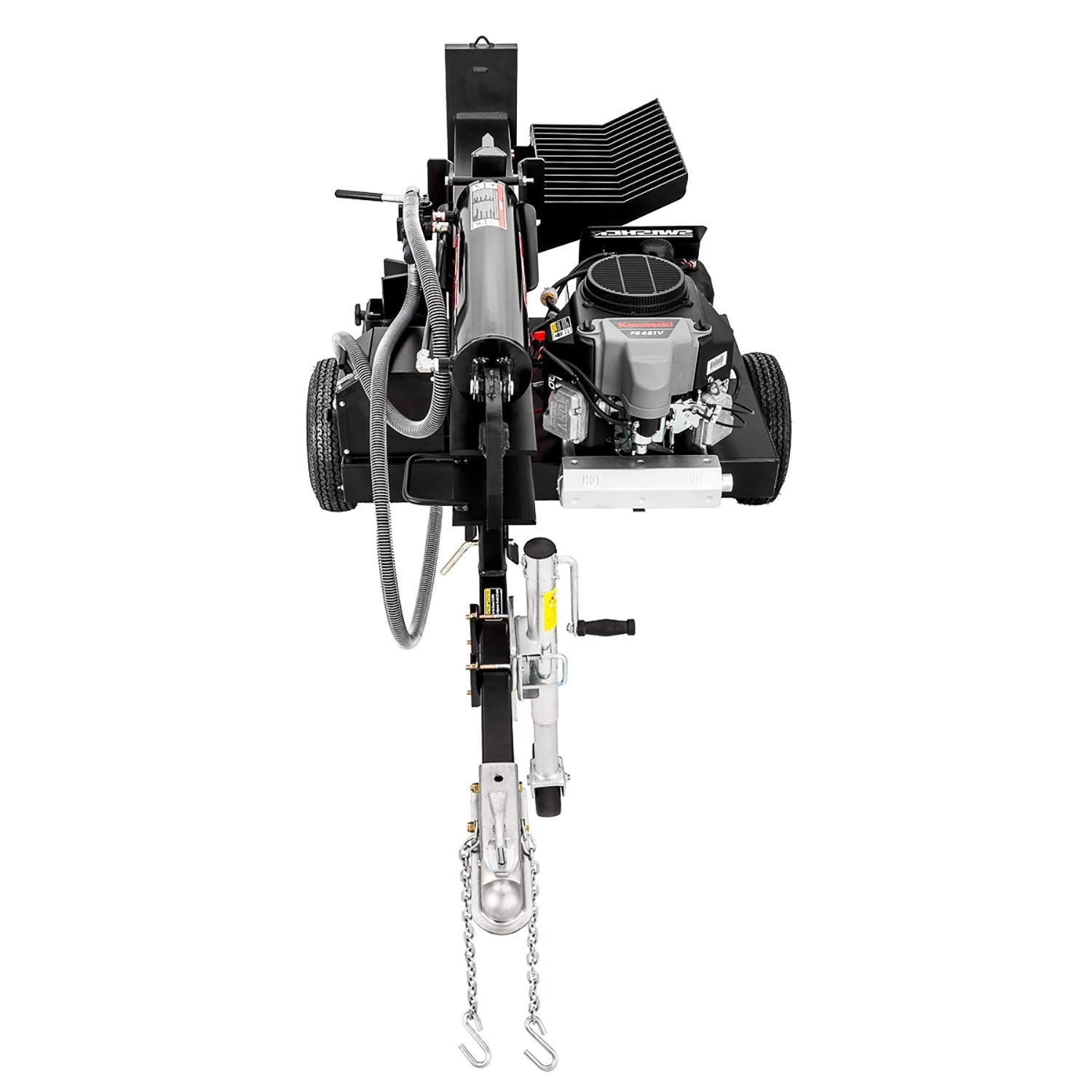 This splitter can function in both horizontal and vertical splitting positions so there’s no need to lift the big rounds, and the adjustable wheeled front stand allows for easier adjusting, hitching, and moving.