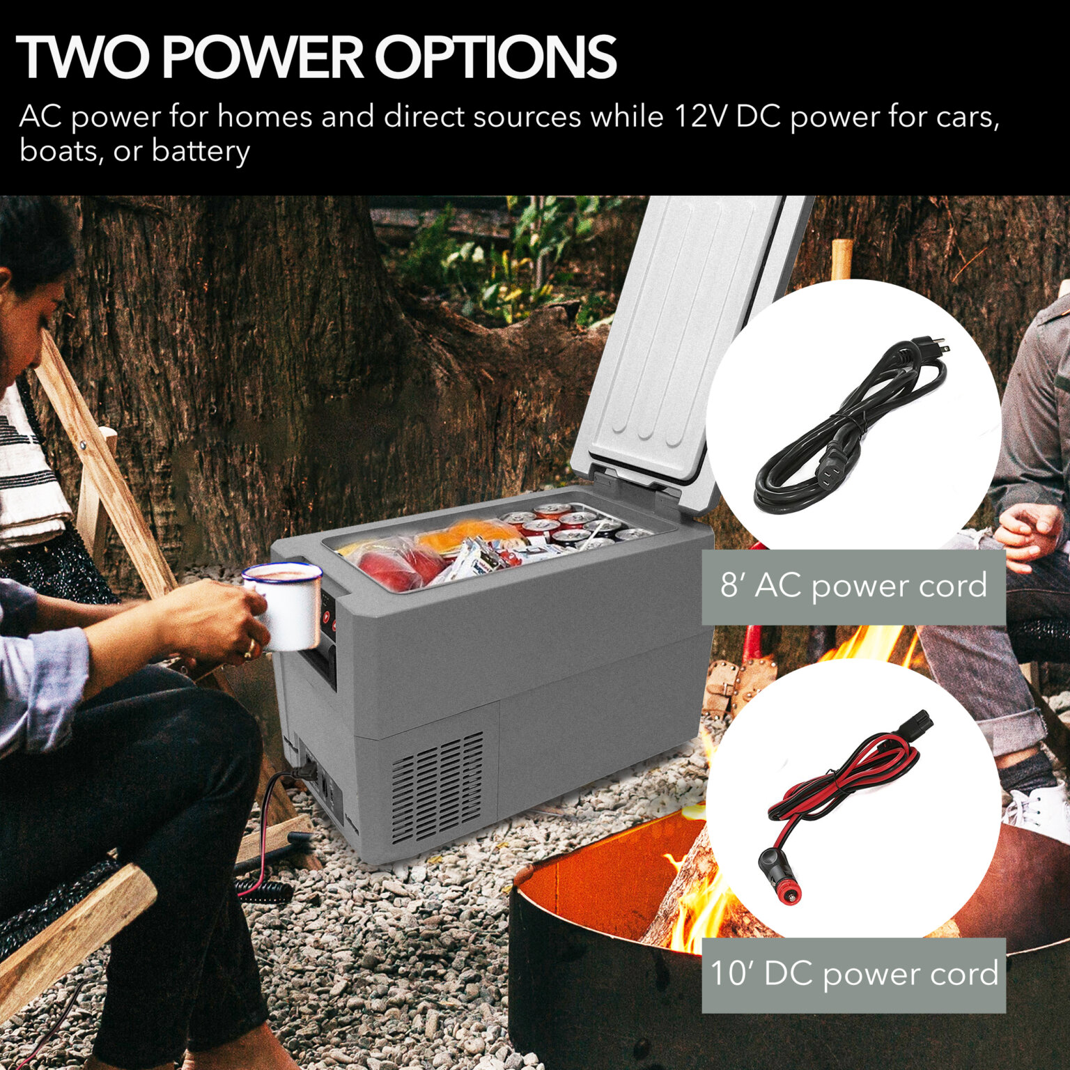 Accessories / Power Cords: 8′ AC power cord and 10′ DC power cord, Large and small removable wire baskets